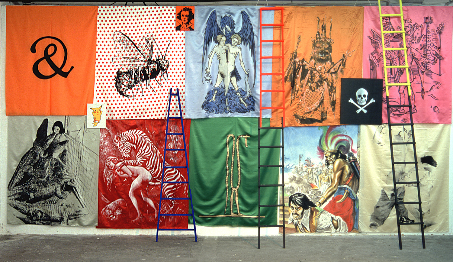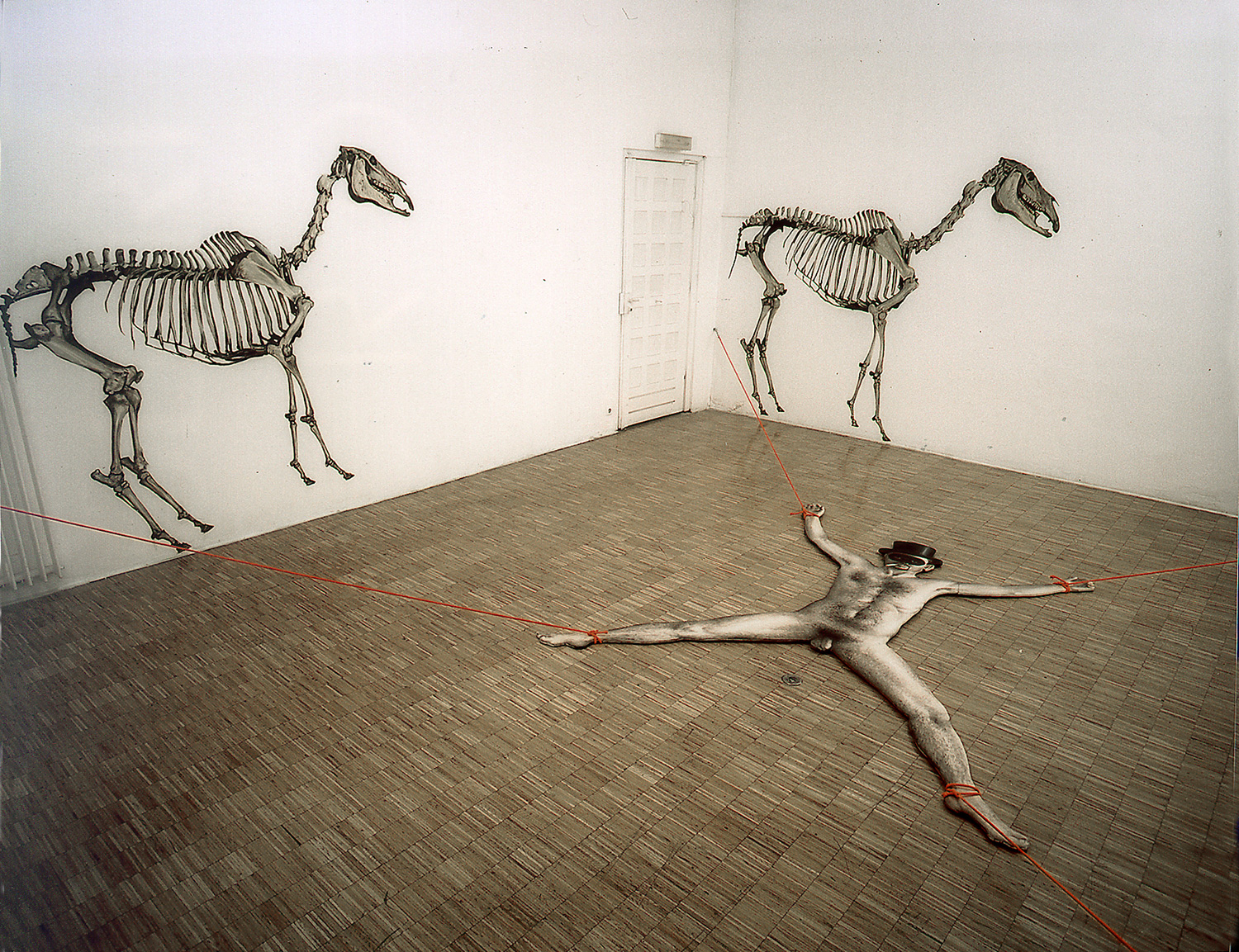 Huile sur bois, corde, coton fluo, huile sur toile, environ 220 x 600 x 600 cm
