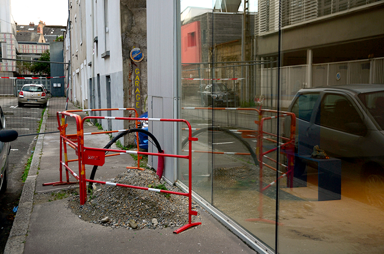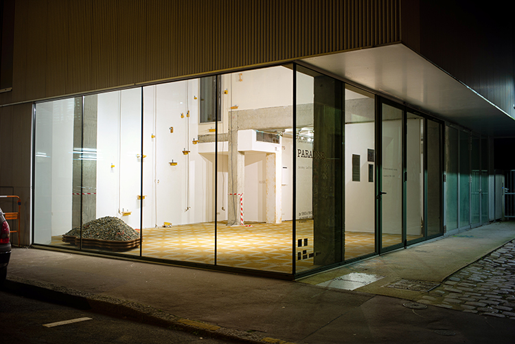 À gauche : vue du tas de gravats devant l’espace de la galerie avant intervention, 2020