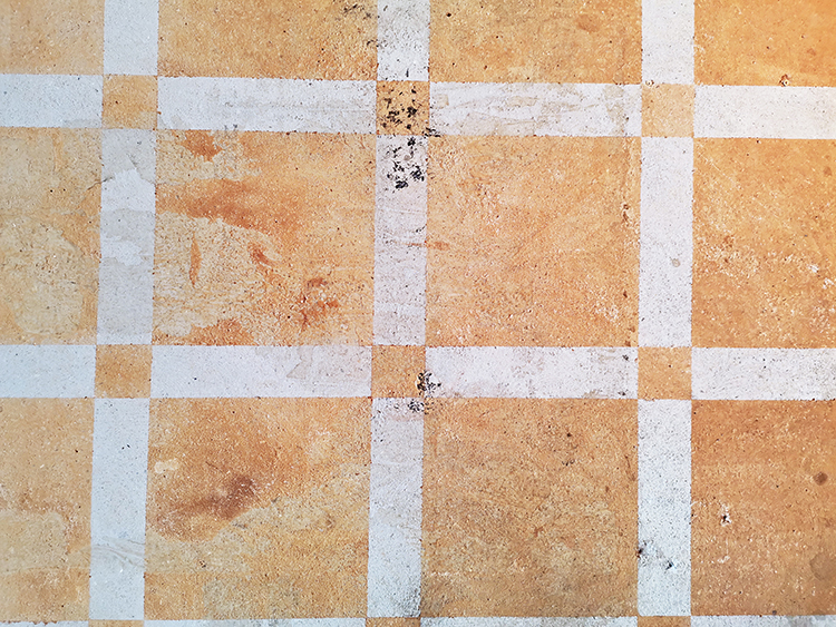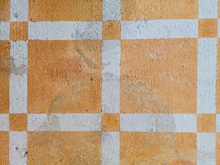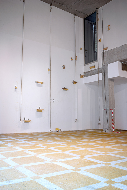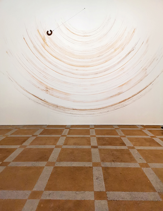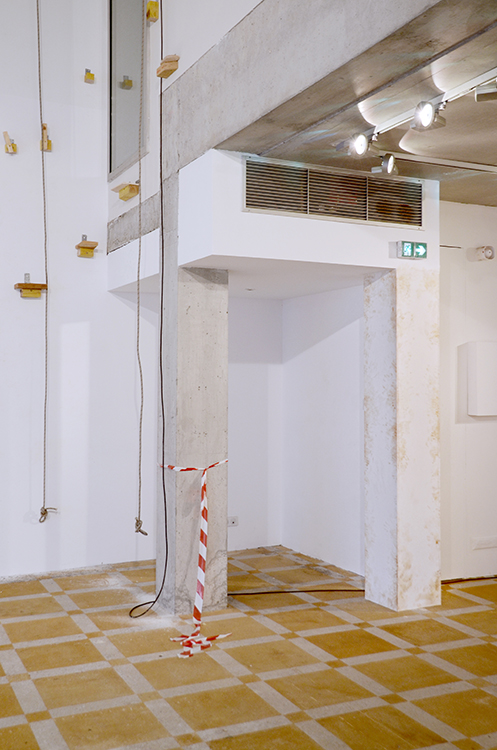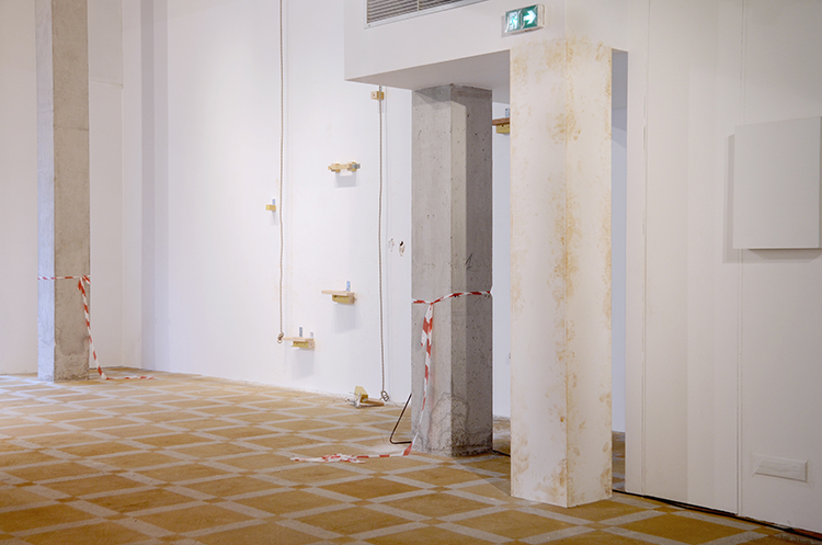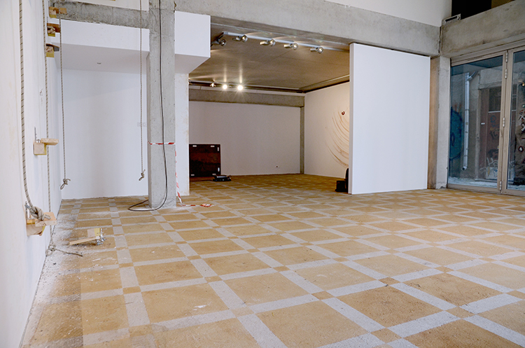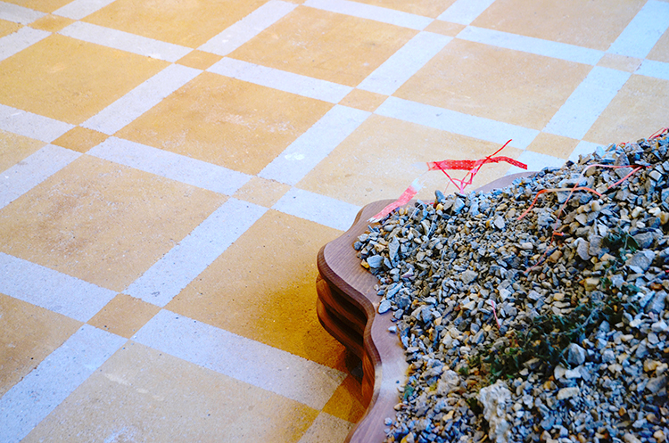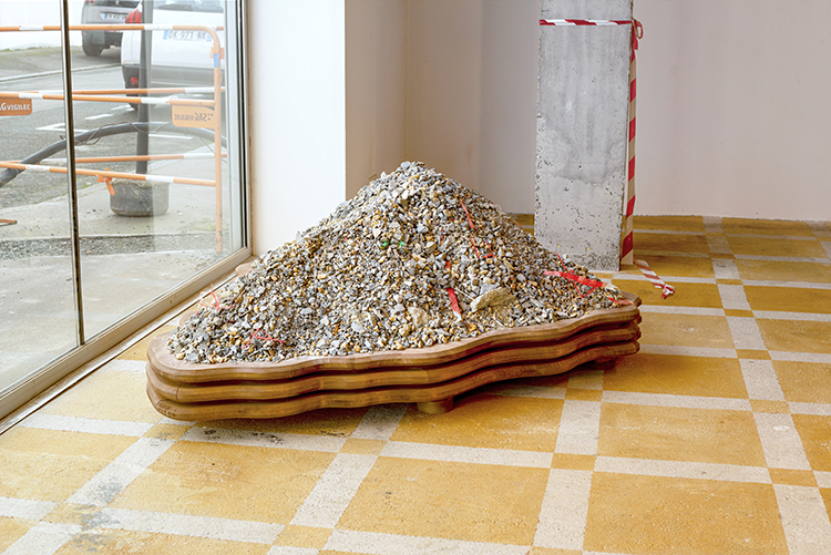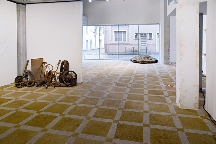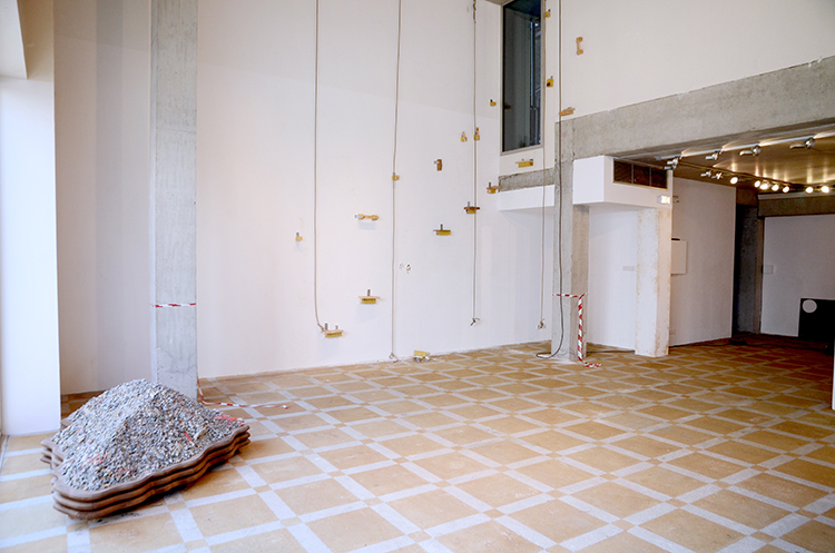 Scénario improbable aux sources hybrides, un tas de gravats provenant d'un trou de chantier devant la vitrine devient une sculpture de gros oeuvre sur socle, dans une galerie quadrillée au sol par une poudre de rouille imitant le dallage d'un palais vénitien. Avatar du damier de Lewis Caroll à la façon de la faille temporelle et citation d'un détail d'une peinture de la collection du Musée des Beaux-Arts de Nantes, ce carrelage de fortune fait entrer, en réalité, le visiteur dans la projection grandeur nature de l'arrière plan de la Vénus d'Urbin du Titien, tableau en fait lui-même déjà copie d'un autre tableau.