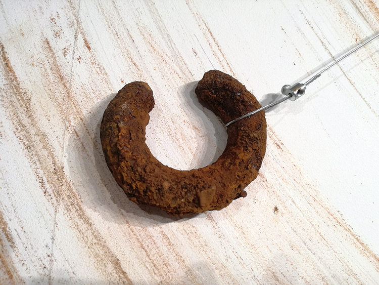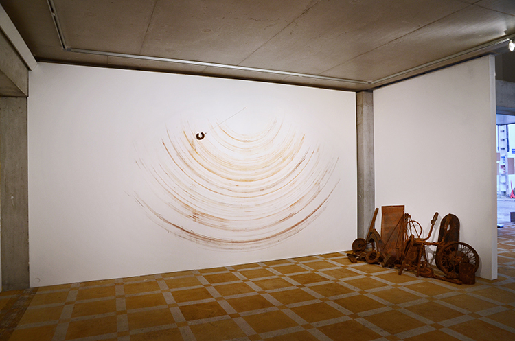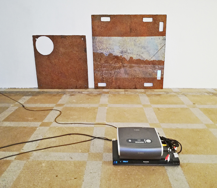 Rébus formel et visuel qui a pour point de départ, la rencontre de l'artiste avec des pêcheurs à aimant qui ont pour activité de loisir de draguer le fond de la Loire en quête d'épaves, les motifs et les architectures ici s'entrecroisent, se compilent et se confondent pour contrarier un certain ordre des choses. Des prises d'escalade et une fausse colonne font face à un pendule et le dessin primitif au mur d'une ondulation tracée à partir du frottement des objets dragués. Une vidéo de pêche sous-marine prend des allures de peinture abstraite et de papier marbré sur un support oxydé devenu écran de projection.