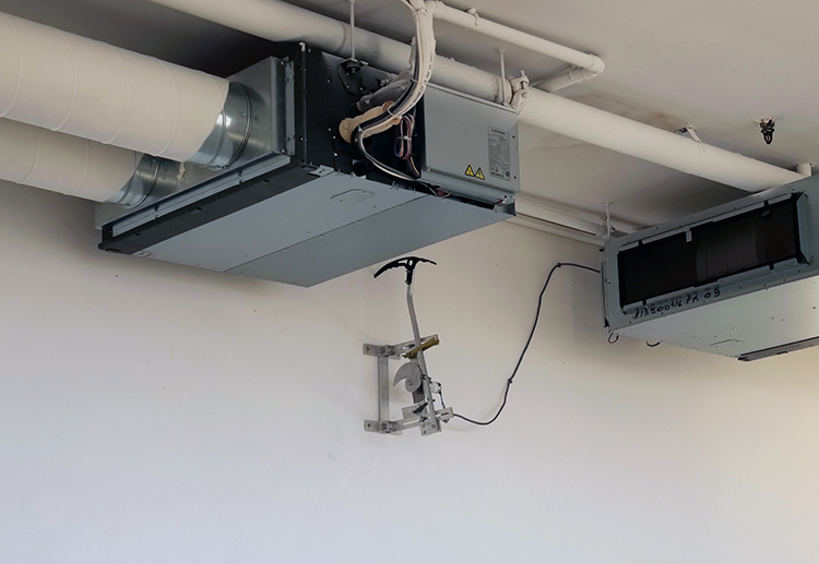 Parmi les artistes exposant dans la vaste coursive vitrée du neuvième étage de Buropolis, certain-e-s disent avoir entendu gémir l’ossature métallique. Après cinquante ans de service à peine, ce bâtiment conçu en 1971 par des architectes y voyant alors un miracle de légèreté, de vides, de sols et de cloisons modulables, sera détruit dans quelques mois. Plusieurs propositions font directement écho à cette absurdité motivée par la spéculation immobilière. La menace imminente est présentifiée par le martellement alerte d’un picus viridis ou pic vert annonçant la saison des marteaux-piqueurs, des coups de masses, des dynamitages. L’animal en question (Epilêpsis, 2013), conçu par Jérémy Laffon, est un piolet mécanique activé au moyen d’un détecteur de présence inversé se mettant en marche lorsque qu’aucun mouvement n’est capté alentour. Kiakiakiakia-kiakiakiak picasse (c’est le nom de son cri) l’animal-outil commençant à trouer le mur de son bec pointu.