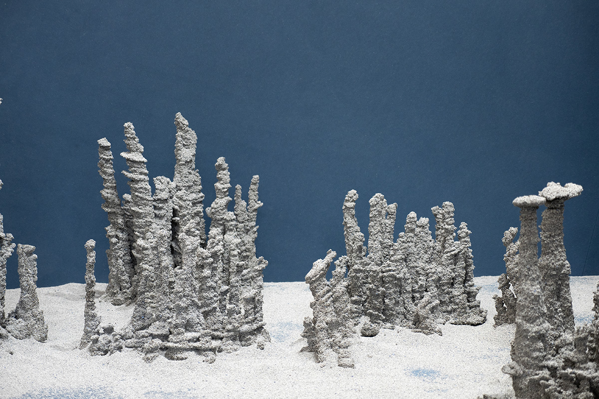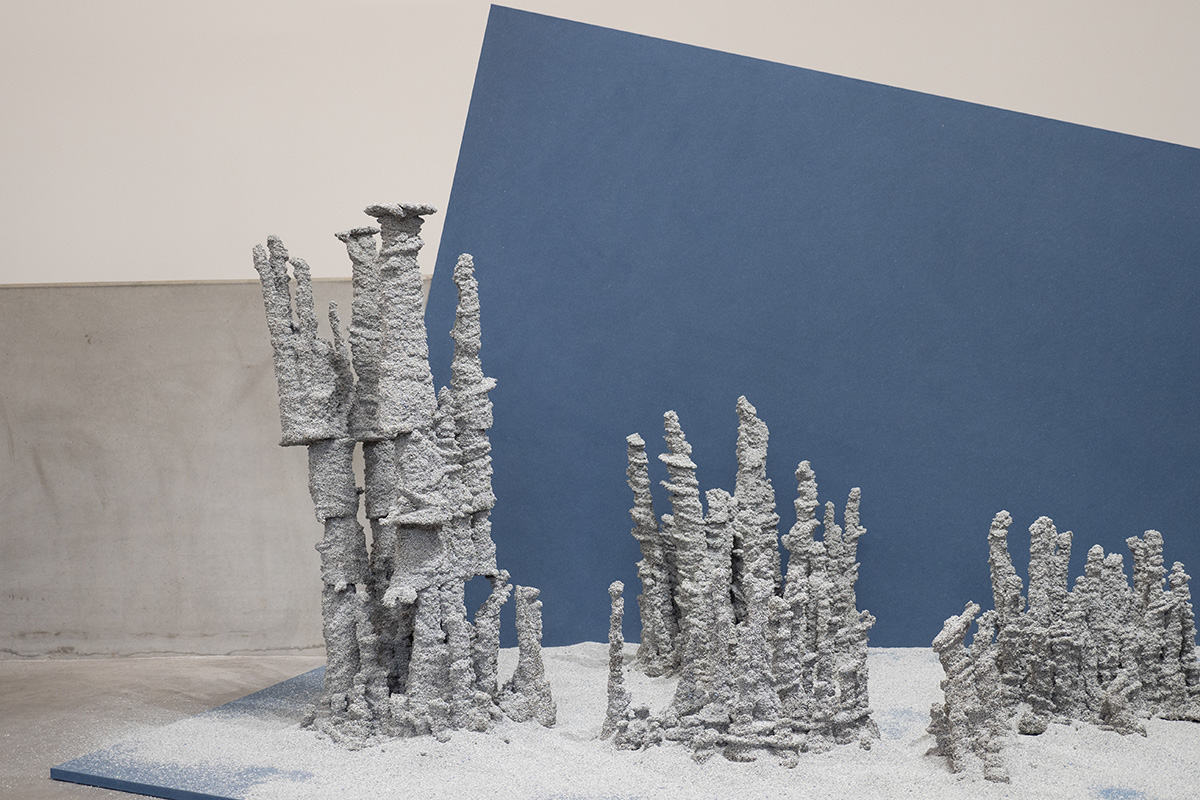Sculptures aléatoires, litière pour chat, résine, MDF teinté dans la masse.