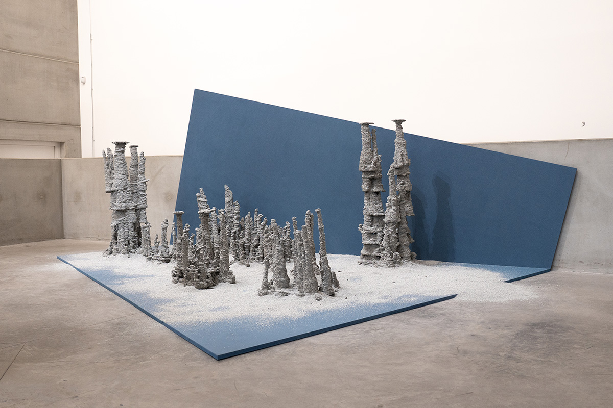 Plaques d’acier brossées et cirées, pierres de sel, cailloux.