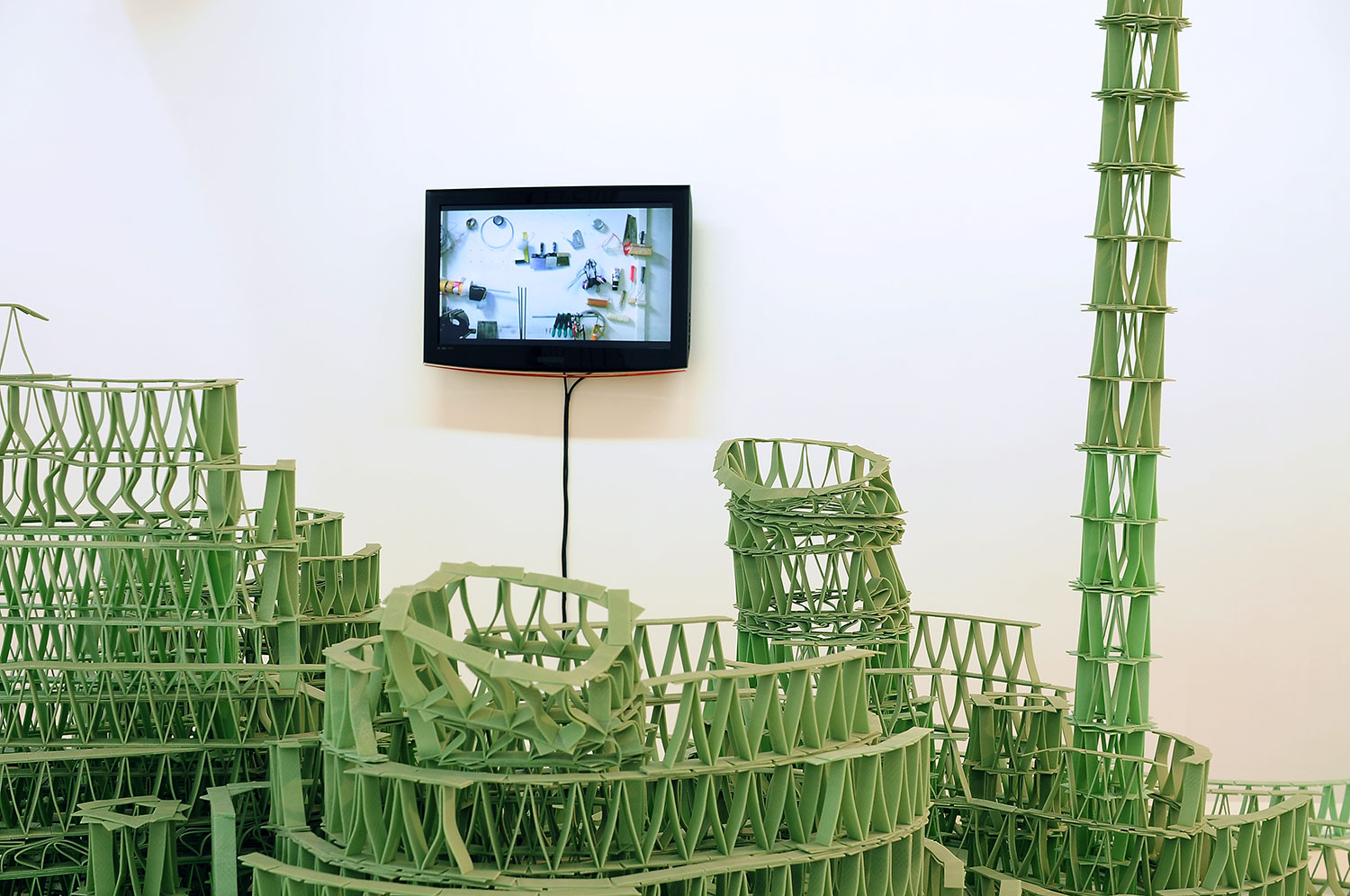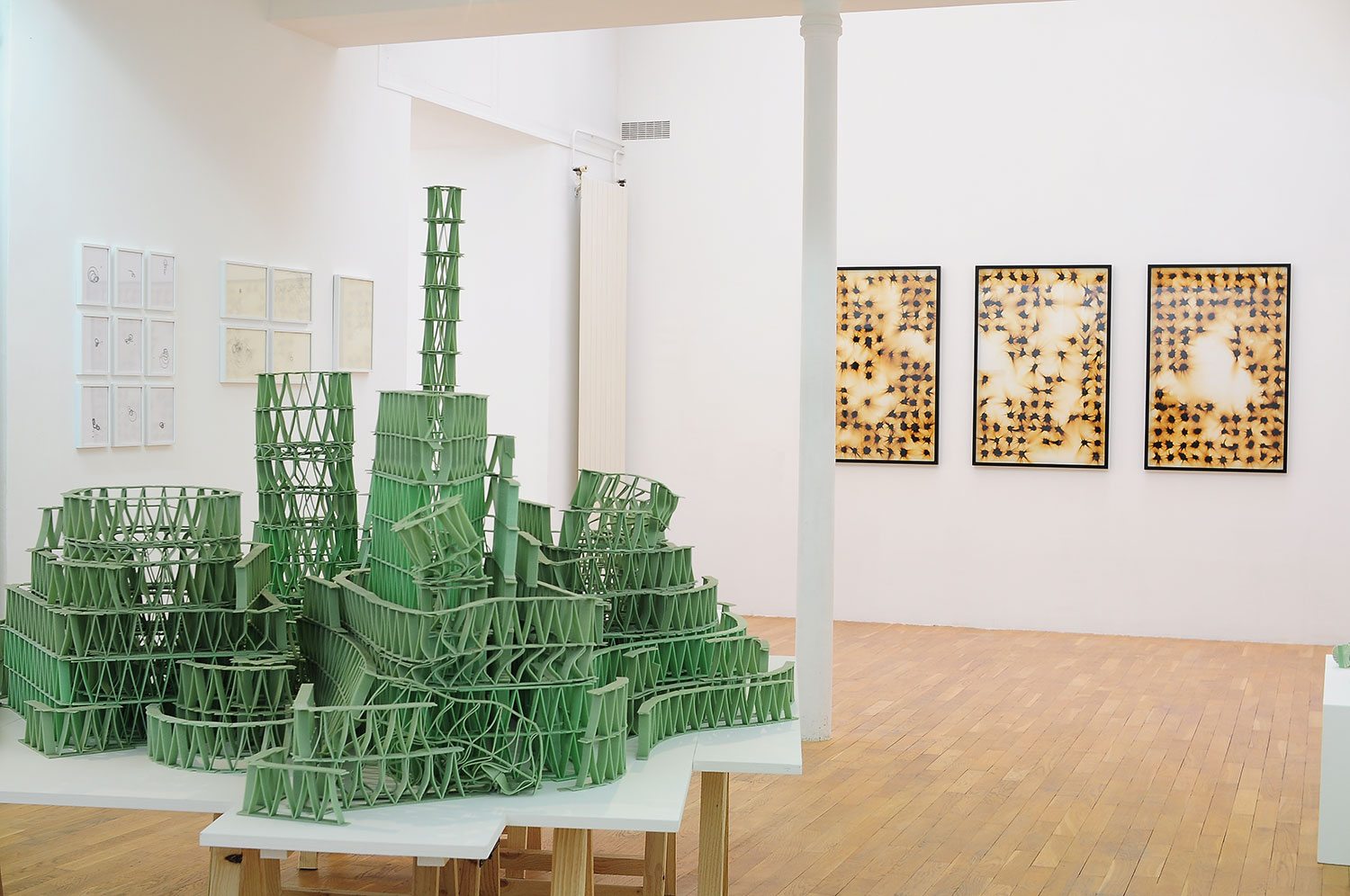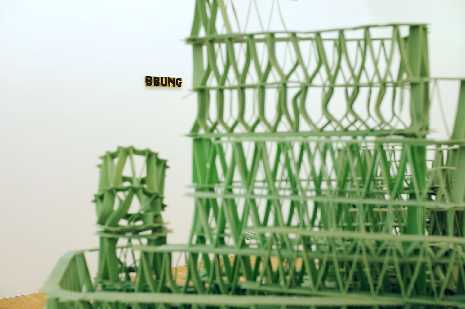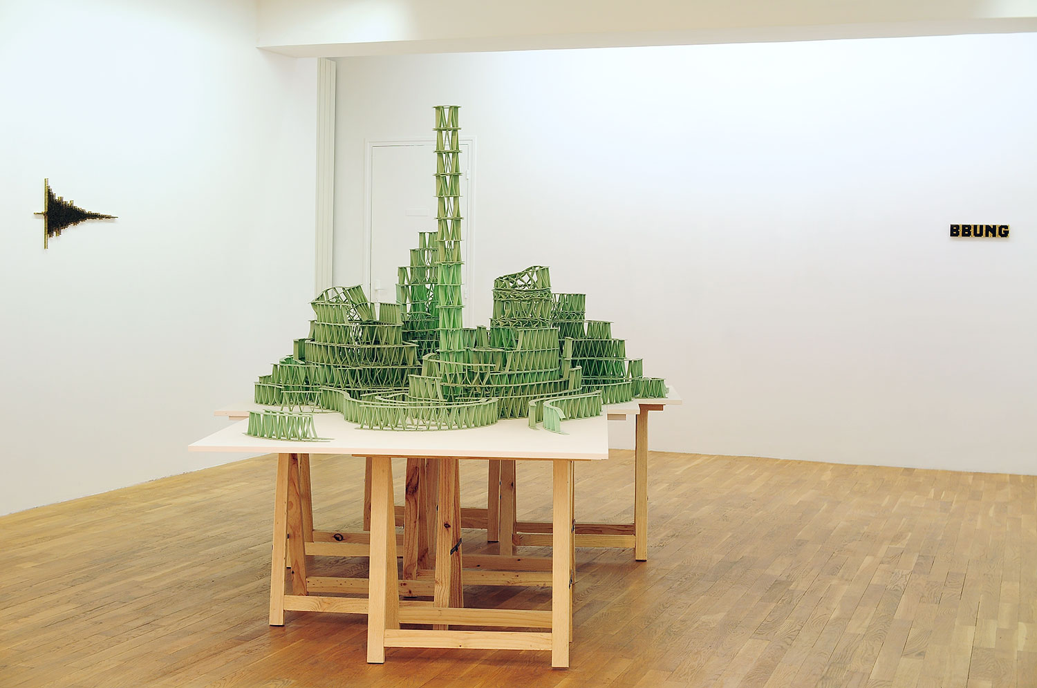 Jérémy Laffon poursuit son exploration buissonnière de la plasticité du chewing-gum qu'il s'approprie jusqu'à épuiser les potentialités esthétiques du matériau. Cette construction-accumulation appartient au genre reconnu de la sculpture d'objets-marchandises. Il joue à travers elle les "sculptectes" et met en oeuvre les tablettes chlorophylles pour lutter contre la gravité dans tous les sens du terme. Cette pratique de "chewingtecture", à l'image de la matchitecture, requiert du temps de labeur, de l'énergie, de l'attention, une rigueur extravagante et un zèle de mise en forme baroque. Tout ici est une question d'équilibre et de chimère. L’ivresse procurée par la pulsion génésique se confronte avec la sévérité des faits d'un ouvrage de labeur. L'élévation de la charpente aux modules d'une radicale uniformité se confronte au corps proliférant de la sculpture dans une composition perpétuellement remise en question. Le détournement d'un objet de consommation équivoque ( indigeste, il résiste à sa consommation/destruction, ne nourrit pas mais coupe la faim) pour "mal élevé" se confronte à une pulsion primaire et structurante de création artistique (il nourrit une pratique singulière de l'Art). Le bricolage d'un délirant jeu de mécano se confronte à un acharnement à monter de l'utopie (héroïsme et inconscience). Sa forme d'exposition, mise en jeu sur la table, se confronte avec son inachèvement comme condition existentielle. Son ampleur ironique et absurde se confronte à sa fragilité, dans l'attente d'une chute comme pour une bonne histoire (et comme pour toute histoire "drôle" réussie, le drame n'est pas loin). La présence physique concrète de l’œuvre se confronte à ses représentations, à toutes les interprétations et tous les désirs de figuration. A mesure que l’œil circule émergent des bulles de sens de cette cryptostructure. Liste non exhaustive par désordre d'apparition :