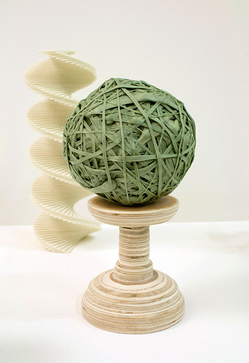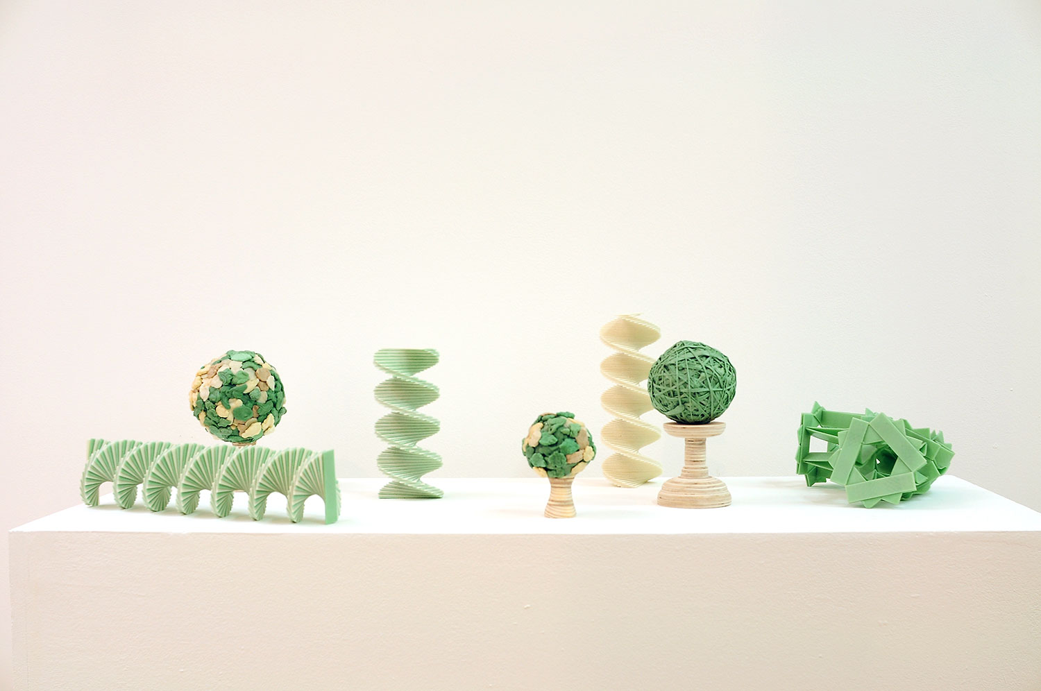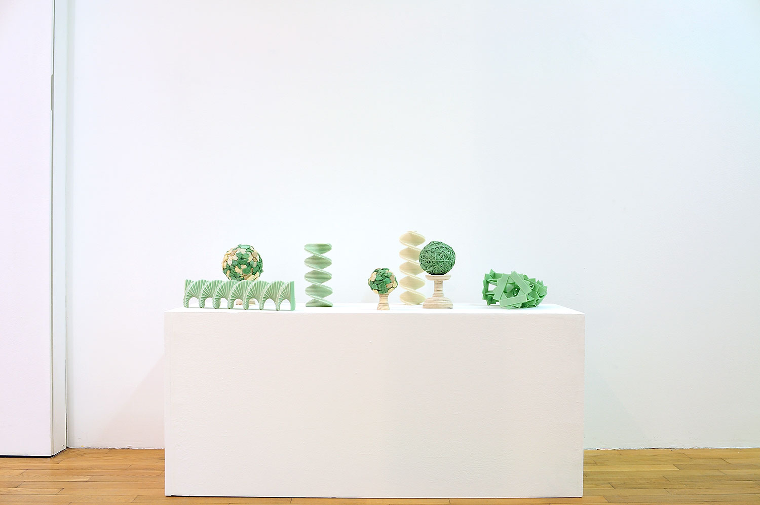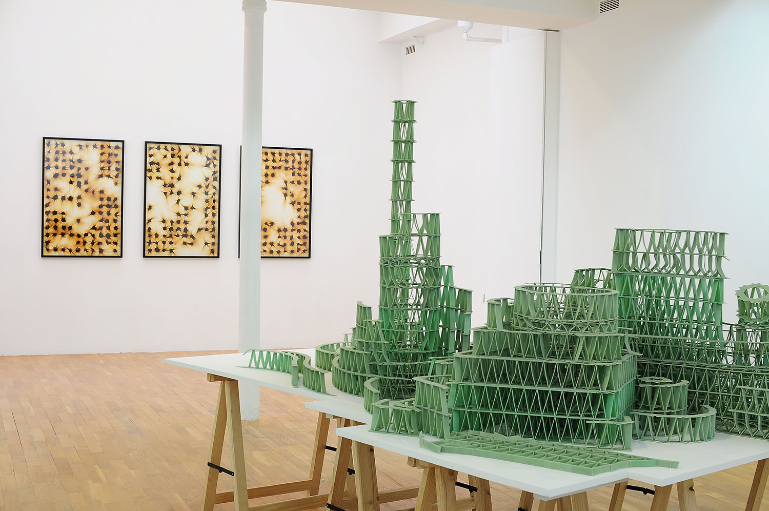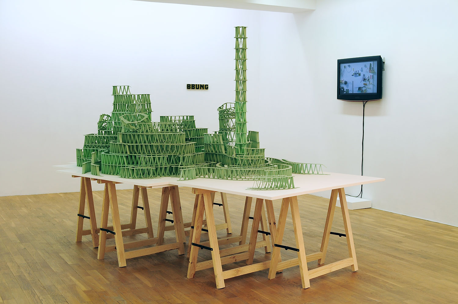 Jérémy Laffon poursuit son exploration buissonnière de la plasticité du chewing-gum qu'il s'approprie jusqu'à épuiser les potentialités esthétiques du matériau. Cette construction-accumulation appartient au genre reconnu de la sculpture d'objets-marchandises. Il joue à travers elle les "sculptectes" et met en oeuvre les tablettes chlorophylles pour lutter contre la gravité dans tous les sens du terme. Cette pratique de "chewingtecture", à l'image de la matchitecture, requiert du temps de labeur, de l'énergie, de l'attention, une rigueur extravagante et un zèle de mise en forme baroque. Tout ici est une question d'équilibre et de chimère. L’ivresse procurée par la pulsion génésique se confronte avec la sévérité des faits d'un ouvrage de labeur. L'élévation de la charpente aux modules d'une radicale uniformité se confronte au corps proliférant de la sculpture dans une composition perpétuellement remise en question. Le détournement d'un objet de consommation équivoque ( indigeste, il résiste à sa consommation/destruction, ne nourrit pas mais coupe la faim) pour "mal élevé" se confronte à une pulsion primaire et structurante de création artistique (il nourrit une pratique singulière de l'Art). Le bricolage d'un délirant jeu de mécano se confronte à un acharnement à monter de l'utopie (héroïsme et inconscience). Sa forme d'exposition, mise en jeu sur la table, se confronte avec son inachèvement comme condition existentielle. Son ampleur ironique et absurde se confronte à sa fragilité, dans l'attente d'une chute comme pour une bonne histoire (et comme pour toute histoire "drôle" réussie, le drame n'est pas loin). La présence physique concrète de l’œuvre se confronte à ses représentations, à toutes les interprétations et tous les désirs de figuration. A mesure que l’œil circule émergent des bulles de sens de cette cryptostructure. Liste non exhaustive par désordre d'apparition :