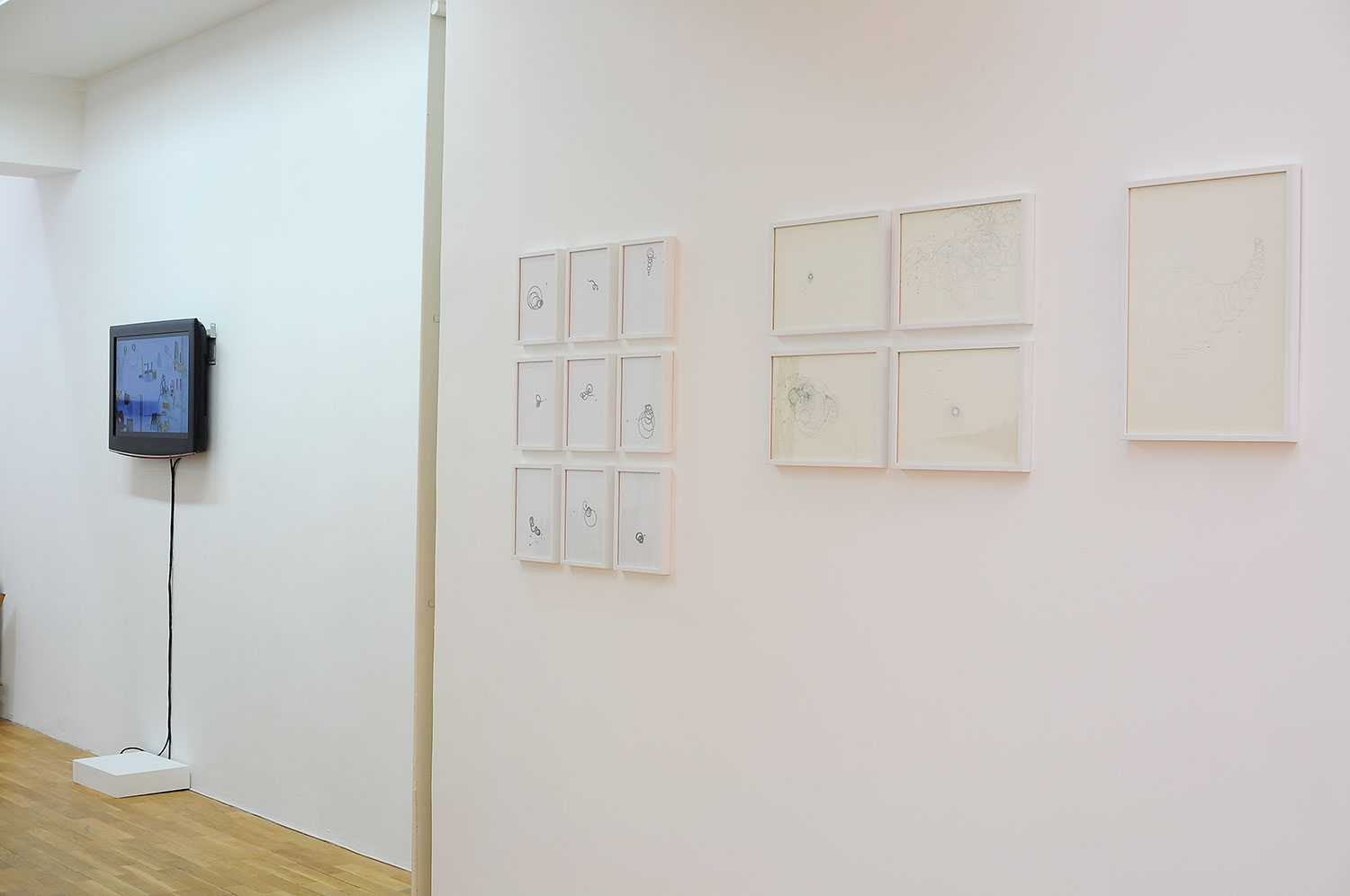 Il suffit de regarder cette série pour comprendre qu'il est ici question de circonvolutions. Les dessins de cette série se font à la main. On retrouve le vocabulaire classique du dessin (traits, lignes, courbes, composition... ) et son crayonnage mais on fait face à une transgression des règles de formation académique. Il n'est pas ici un outil élémentaire mais un procédé principal d'expression. Il se fait ici sans modèle, résultat d'une gestuelle et d'un dispositif où il est question de naviguer aux instruments, le geste allégorique du crayon qui tourne en rond. Cette position néoromantique se confronte au jeu expérimental de l'originalité, à un protocole postminimaliste dans l'acte de dessiner et à une apparence qui nous fait immédiatement penser à de l'abstraction lyrique. Et qu'on ne se trompe pas sur le tropisme du pseudo-aléatoire, l'artiste nous interprète ici le double jeu de l'accidentel, car il est possible d'acquérir un réel savoir-faire, voire de la virtuosité par la pratique à la toupie. Le dessin reste "jeu de main" et plaisir. De quoi devenir un nouveau "Master Player".