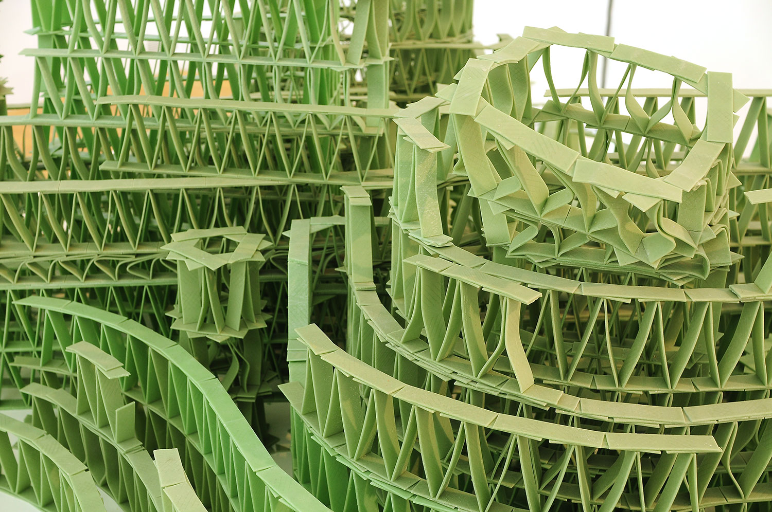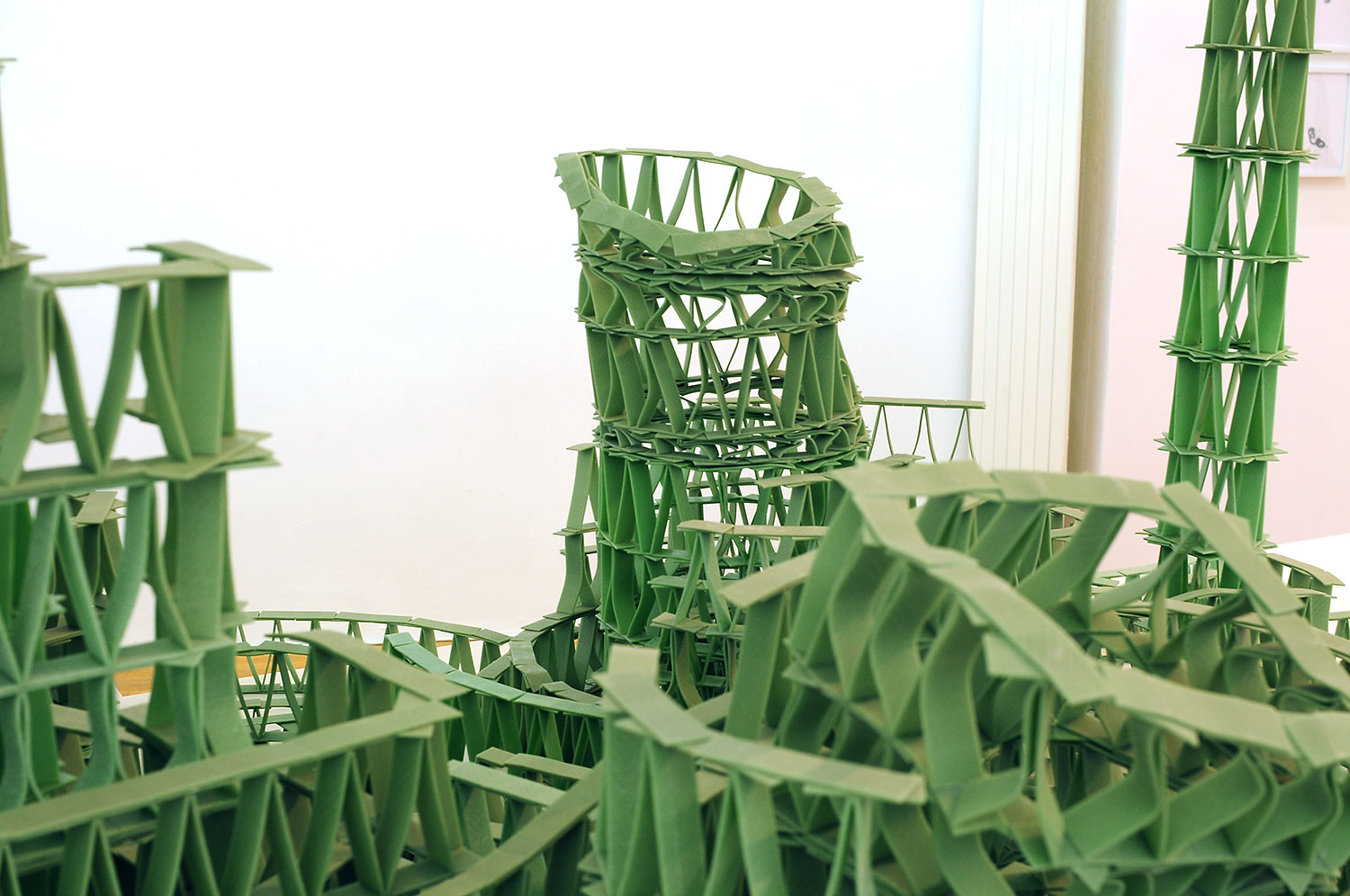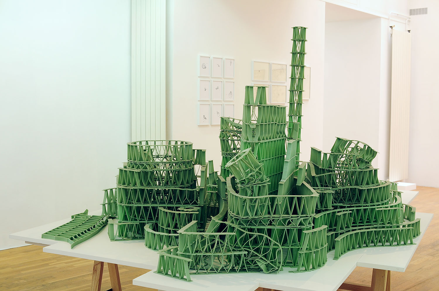 1) maquette obscure d'un treillis modélisant : une architecture futuriste autoritaire et indécise, une construction déconstructiviste, un espace futurologique "autre", un monument bizarre dédié au Débarquement en Normandie, la ruine d'un rêve américain non concluant, un Monument à la Troisième Internationale (ou Tour Tatline) sauce HOLLYWOOD façon Laffon, un dessein de hors-lieu, une molécule foutraque de Slime, une forme mathématique de la théorie du chaos, un réseau-objet aux lois incongrues, une inexprimable nostalgie de l'enfance, un merveilleux rêve d'homme et de Western pour un ruminant, cosmologie du désastre et détour de Babel, l'ADN du jeu