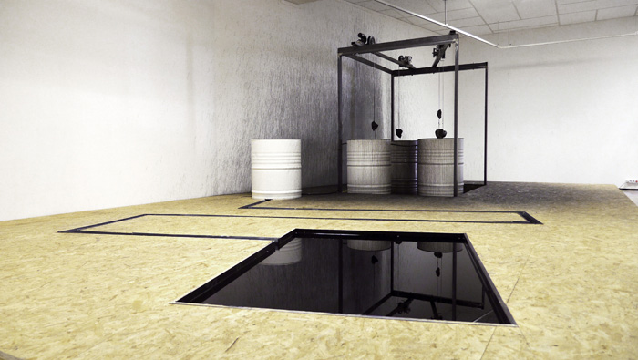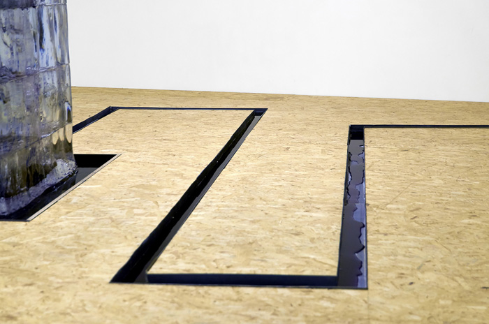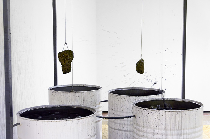 Glace, encre, bois, plomb, pompe à eau, motorisation, fûts, pierres de tuf, 800 x 450 x 250 cm