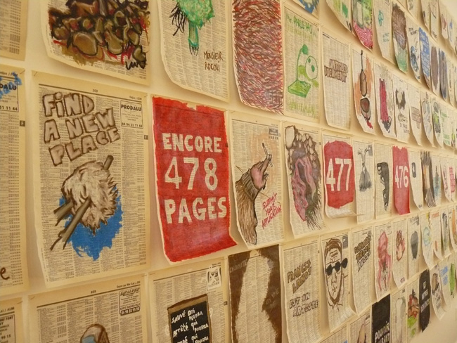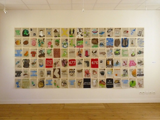 Pour l'ensemble Petit Glossaire d'Images Mentales, Jérémy a troqué le costume du Ping Pong Master Player pour enfiler le «bleu de travail de l'artiste contemporain ». Série de dessin au pastel gras sur des pages arrachées aux pages « blanches » d'un annuaire téléphonique. Il s'agit véritablement d'un travail au sens du labeur librement consenti, dans lequel l'artiste semble « s'éclater » (dans tous les sens du terme), littéralement un work in progress débuté ne 2005. Ce carnet de route de la pensée compte près de 200 fragments. L'un d'entre eux révèle « encore 478 pages » mais on se doute que cette improvisation dynamique peut déborder à l'infini. Si l'annuaire compte un nombre de pages limité, il est renouvelé tous les ans. On peut imaginer qu'il manquera toujours la dernière image. Jérémy incarne dans ce travail une sorte de scribe. Les dessins, sortes de graffitis domestiques, s'égrènent page après page où, comme le titre l'indique, Jérémy couche tout ce qui lui passe par la tête. Pas d'angoisse de la feuille blanche, c'est un type d'activité à la fois répétitif mais toujours renouvelé. Dès le départ, la page n'est pas vierge. Elle est le résultat de l'effeuillage d'une livre sans qualité littéraire. L'accrochage en patchwork leur redonne une verticalité. Un artiste honore son statut dans son activité, dans le faire, les mains dans le moteur. L'ensemble fonctionne ni comme critique, ni comme image globale d'un monde d'images, ni comme problématique mais comme un inconscient artistique affiché qui alimente de son flux continu d'images, de signes, d'attitudes et de mots une oeuvre de fait en perpétuelle évolution. Si on suit la logique du travail de Jérémy, il procède même d'une part de fiction dont l'équilibre se joue, celle de vouloir sans cesse repousser la fin, ce que Gilles Barbier appelle la « rumination ». Dans le faire du dessin, il consomme du temps de création, du temps de mise en œuvre de la « cosa mentale » et se révèle ainsi dans sa position d'artistes.