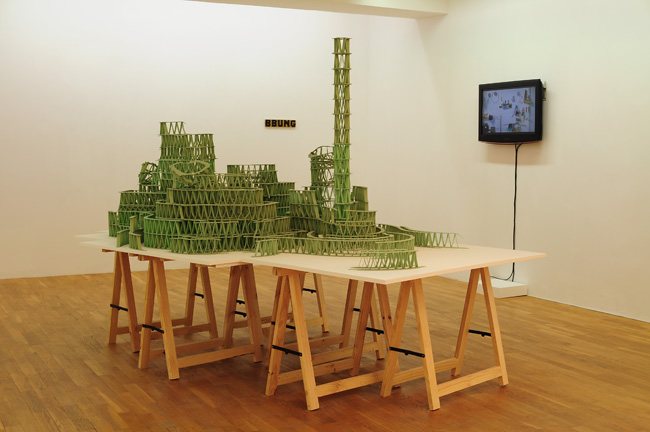 Vue de l'exposition Chlorophénylalaninoplastomecanostressrhéologoductilviridiscacosmographigum (de la famille de l'arbalétrier poracé), Galerie Isabelle Gounod, 2011