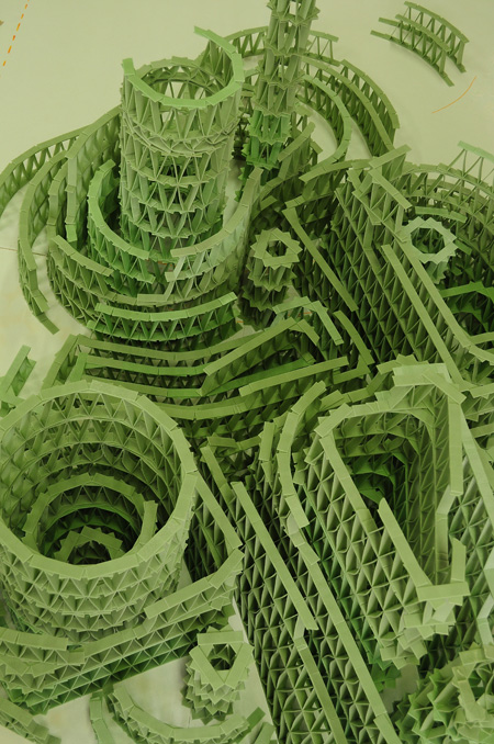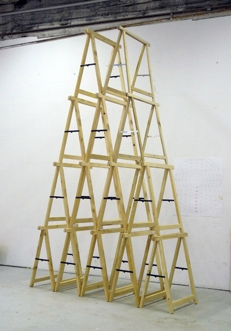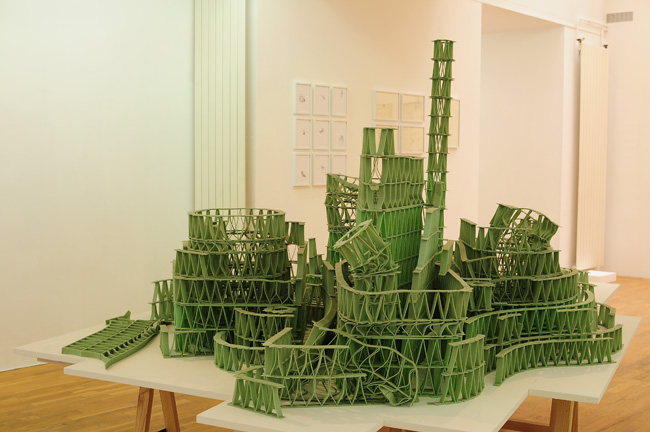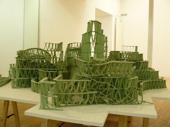 [...] L'élévation de la charpente aux modules d'une radicale uniformité se confronte au corps proliférant de la sculpture dans une composition perpétuellement remise en question. Le bricolage d'un délirant jeu de mécano se confronte à un acharnement à monter de l'utopie (héroïsme et inconscience). Sa forme d'exposition, mise en jeu sur la table, se confronte avec son inachèvement comme condition existentielle. Son ampleur ironique et absurde se confronte à sa fragilité, dans l'attente d'une chute comme pour une bonne histoire (et comme pour toute histoire "drôle" réussie, le drame n'est pas loin) [...] *