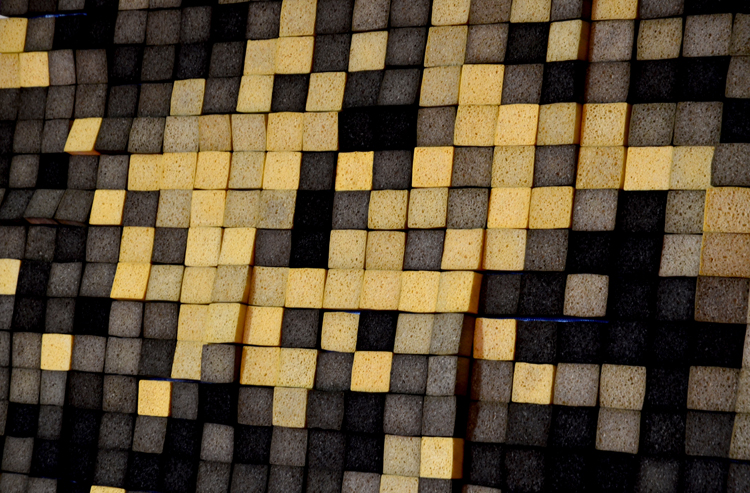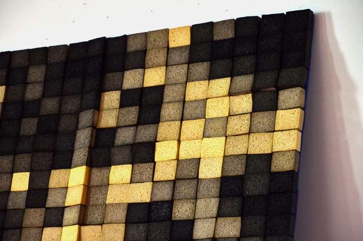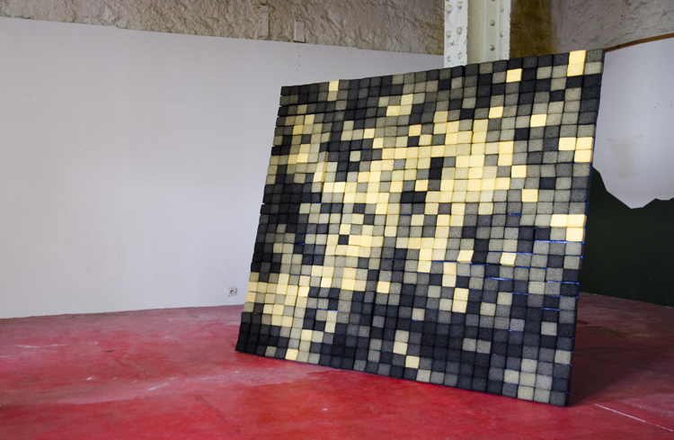 Éponges teintées d'encre de Chine, bâche, résine, structure aluminium, 250 x 300 cm