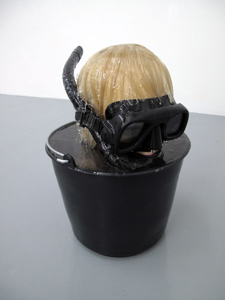 Seau, perruque, buste, masque et tuba de plongée, boucles d’oreilles,