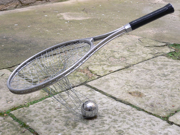 Raquette de tennis aluminium, fil de fer galvanisé, boule de pétanque, 69 x 40 x 28cm