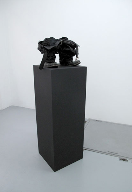 Pantalon, bottes et ceinture en cuir, 40 x 40 x 140 cm (avec socle)