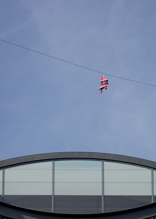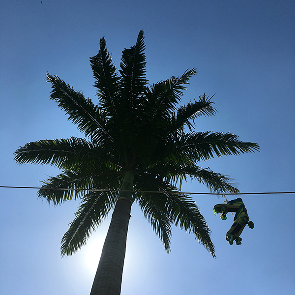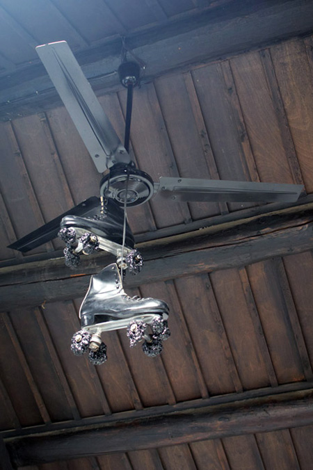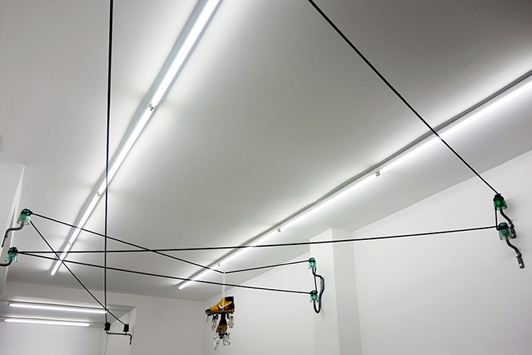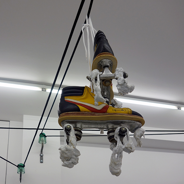 Trois pylônes électriques se regardent en chiens de faïence. Les câbles qui les lient n’alimentent rien d’autres que la rumeur et la perplexité du spectateur attentif. Suspendu à l’une de ses lignes qui découpent le ciel, une paire de patins à roulettes (fondues). La monumentale sculpture de David Ancelin nous plonge dans ses histoires préférées, ces « récits autobiographiques collectifs » et autres légendes urbaines qui battent le pavé et qui n’ont de cesse de se réécrire à chaque irruption. Ses collages bricolés teintés d’humour interrogent l’aventure d’un geste ou d’un objet populaire référencé, toujours trop chargés historiquement, économiquement, socialement.