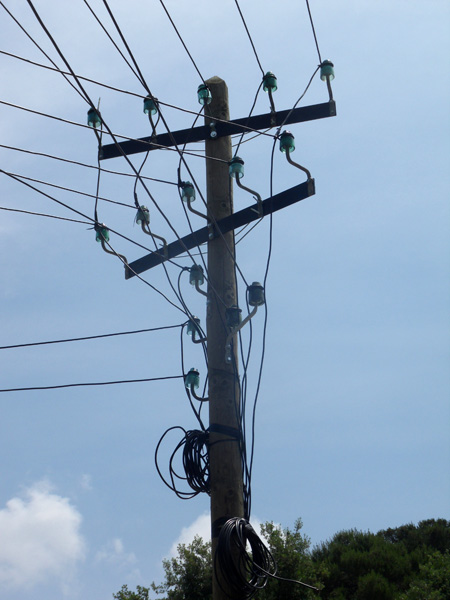 Poteaux et câbles électriques, isolateurs en verre, patins à roulettes, plastique fondu, dimension variable