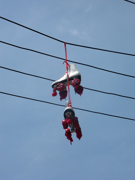 Le principe du Shoe Tossing, aussi connu sous le nom de Shoefiti (contraction de Shoes et graffiti), consiste à utiliser ses chaussures comme projectiles, à la manière de bolas, et de parvenir à les suspendre, lacets noués, à un câble électrique (ou téléphonique). L’origine de cette pratique est floue, son interprétation diverse, même si elle renvoie généralement au thème du rite de passage : paire de rangers (peintes en jaune ou orange) expédiée à la fin du service militaire pour symboliser le retour à la vie civile, baskets usées pour marquer la fin d’une année universitaire ou fêter la perte d’un pucelage. Les sneakers évoqueraient également un code indiquant le territoire d’un gang (ou la mort d’un des leurs), un « lieu de vente » (la couleur des tennis correspondant à une drogue) comme un pont sémantique entre la nature addictive des produits et la paire de chaussures nouée. D’autres racontent qu’on suspendait ses chaussures usées parce que c’était plus drôle que de les jeter à la poubelle.