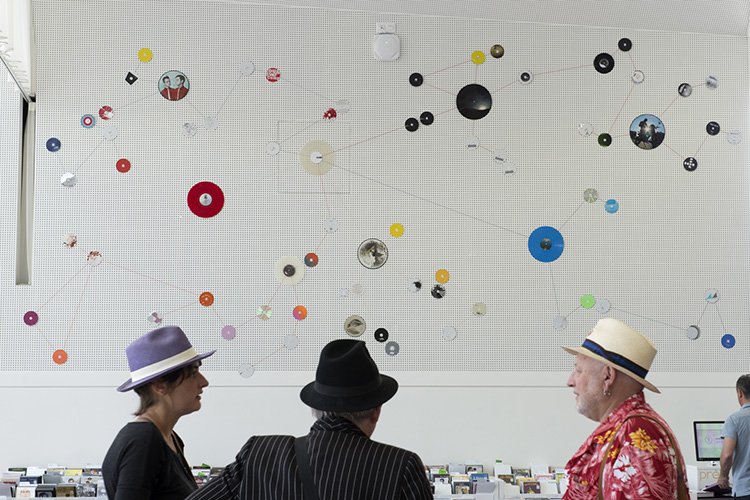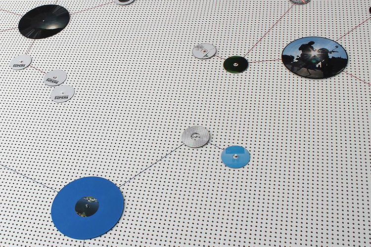 L’intégralité du catalogue Optical Sound affichée au mur constitue le réseau du label, maillage compliqué où chaque musicien entretient un rapport différent au label et aux autres musiciens.