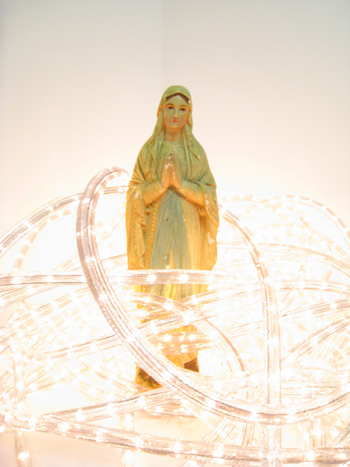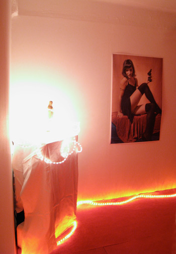 mini scène, rideaux filaires et lamés, parfum, guirlandes...