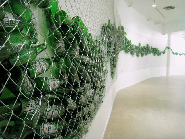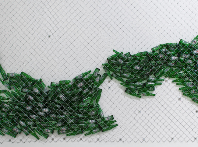 Grillage, canettes de bière vides, dimensions variables (ici : 2100 x 260 cm)