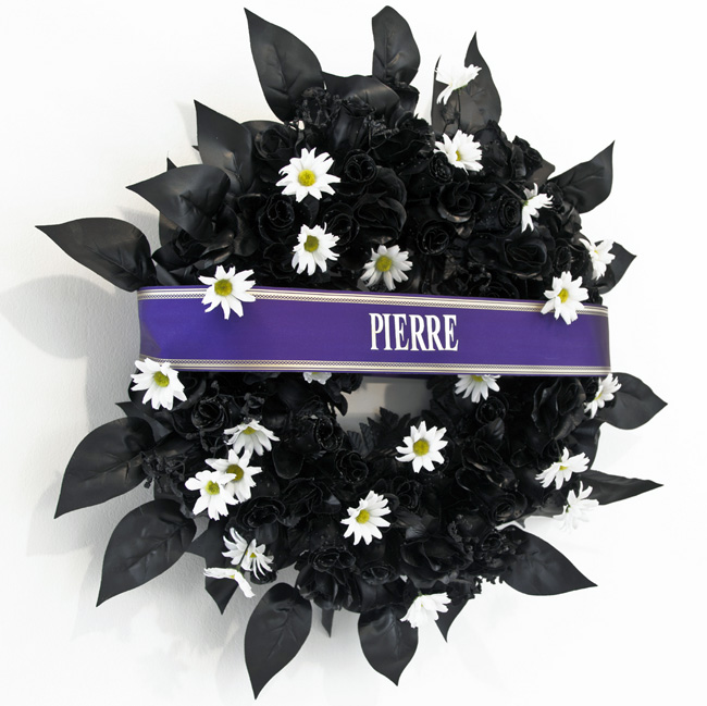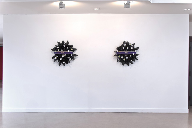 Deux couronnes mortuaires peintes en noir, rubans et typographie