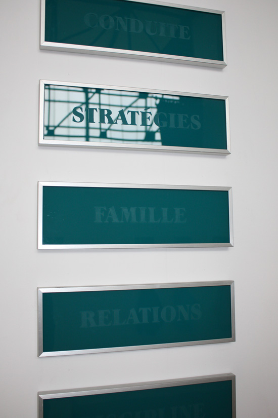 19 plaques en verre cerclage métallique, pochoirs typographiques à l'acide, 39,5 x 12,5 cm