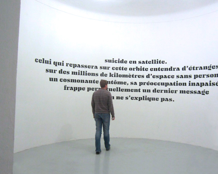 Texte Henri Michaux, pochoir 660 x 320 cm, éclairage, diffusion sonore aléatoire et infinie (Semuta by Servovalve)