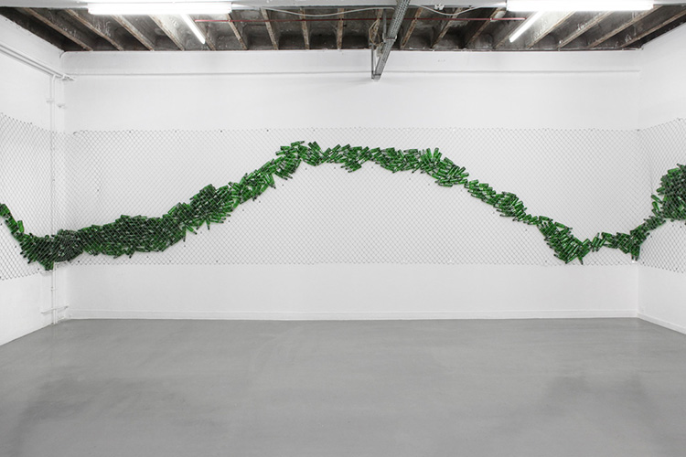 Le processus a été ici reproduit sur une très grande longueur avec rythmes et variations, ainsi qu'avec différentes quantités de bouteilles vides accumulées, telle une vague, une partition; une onde sonore lisible par le visiteur dans son déplacement sur un long mur.