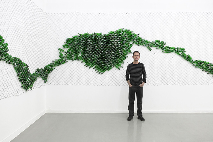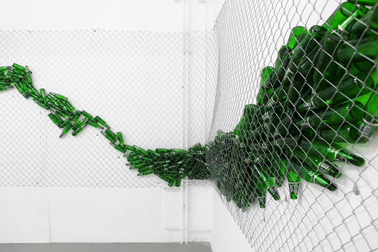 Bas-Relief est constitué de deux matériaux qui sont des bouteilles de bières en verre et d'un grillage industriel métallique. La couleur de verre spécifique (bouteilles vertes) a été utilisée afin de travailler un monochrome et un geste plastique fort.