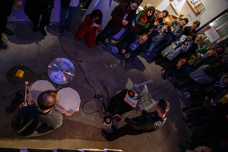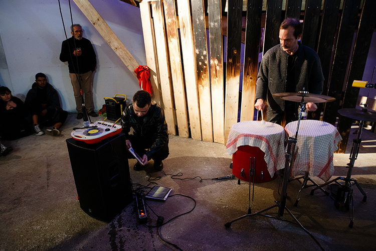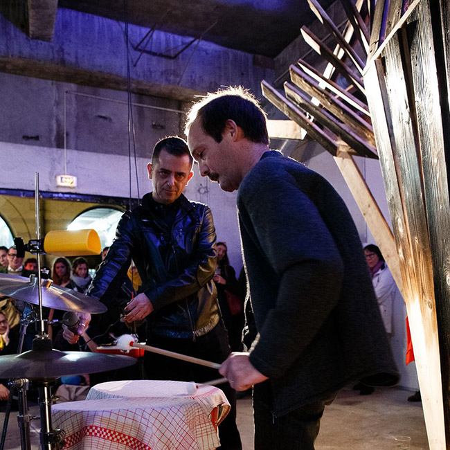 Pierre Beloüin et Simon De La Porte sont tous deux artistes plasticiens, ils présenteront pour la première fois dans le cadre du Vrrrr leur création : INTERNATIONAL PANASONIC AND A DRUMMER. Se plaçant en hommes de pailles articulés au cœur d’une installation ils joueront le dispositif, avec ou sans public pour une durée indéterminée. Roulements de tambours, drones électroniques et spoken words sur un fil de rasoir conducteur. |