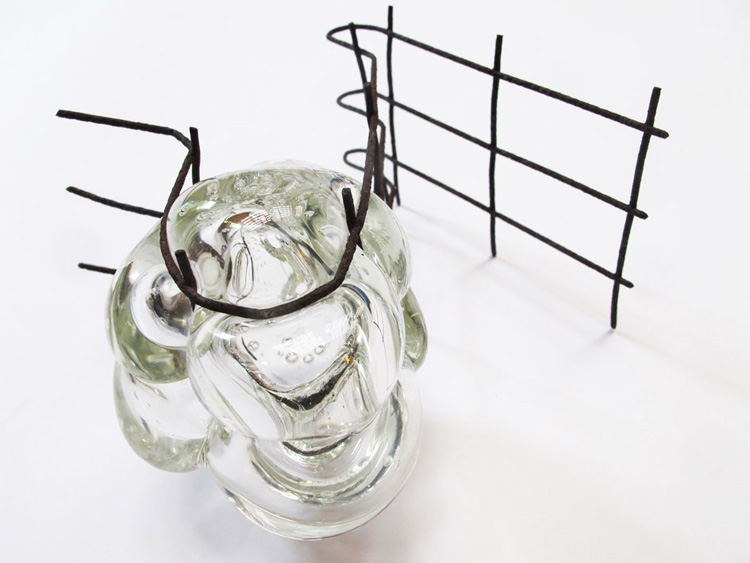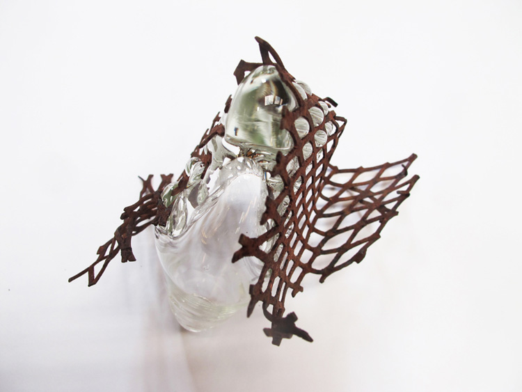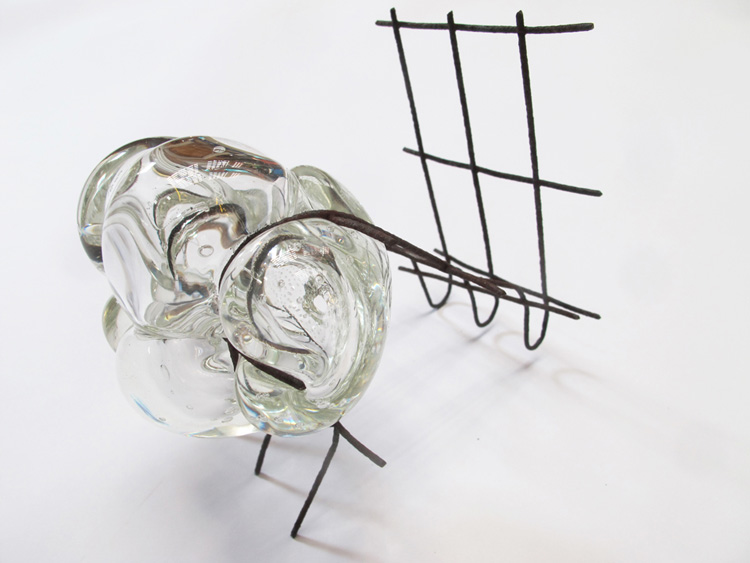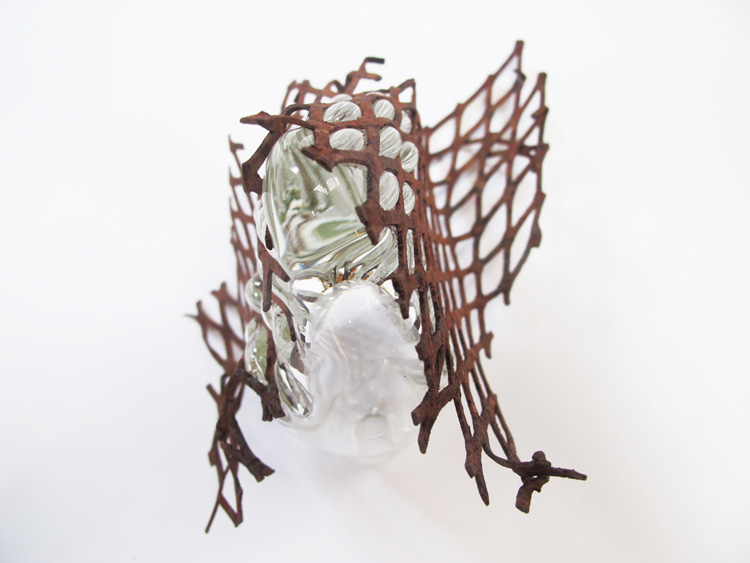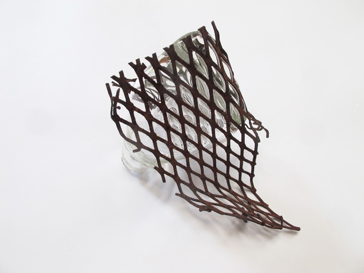 Rendez vous 2015 Serie de sculptures, workshop, Triangle, New York, USA Rencontre entre le verre et le métal. Jeux physique et optique de la déformation du verre à travers le motif de métal.