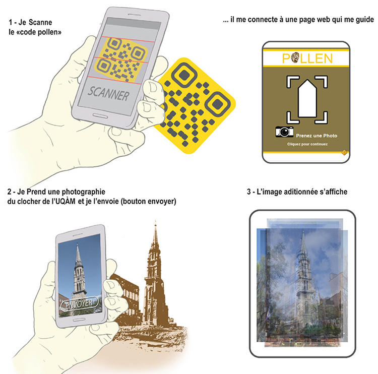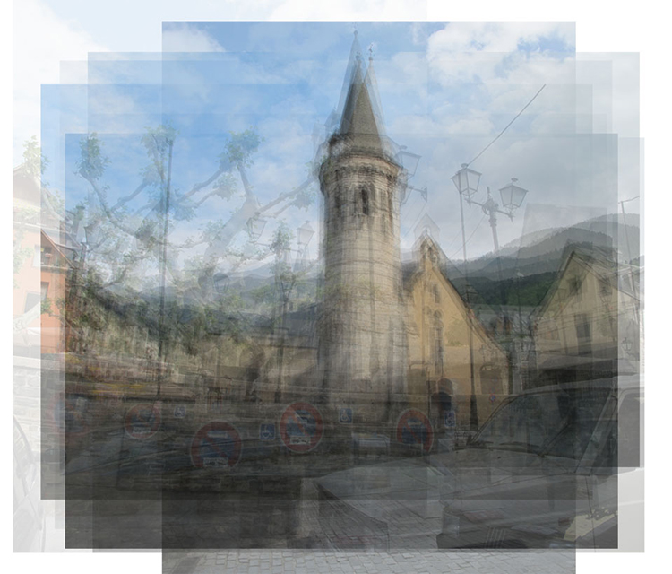 Cette installation interactive propose une interaction par le biais d’un QR code et propose au visiteur de prendre une photo de l’église. La photographie envoyée vient se surajouter aux photographies déjà prises par les autres visiteurs créant une seule image à partir de toutes les images envoyées. A chaque participation la composition évolue. Dans ce jeu d’espace-temps, l’église prend une dimension à strates temporelles.
