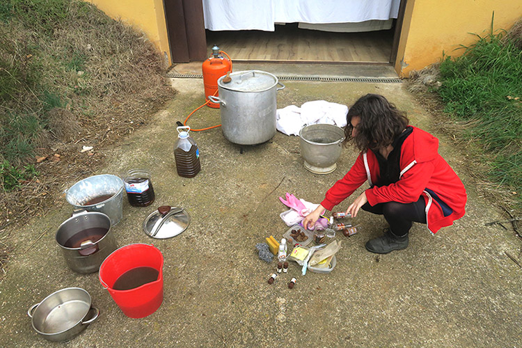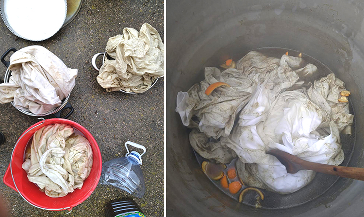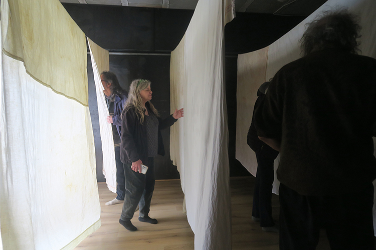 La pluie menace, la tramontane souffle fort depuis quelques jours. Le linge est bouilli dans une très grande marmite d’odeurs composées au fur et à mesure de la cuisson. Une épaisse vapeur s’échappe, les tissus se teintent et s’imbibent. Ils sont transvasés et trempés encore dans la décoction jusqu’à être tordus pour en extraire les jus colorés, puis étendu sur les cordes dans le centre d’art. L’espace se traverse en passant à travers les plans verticaux humides et chauds des tissus qui dégagent leurs effluves. |