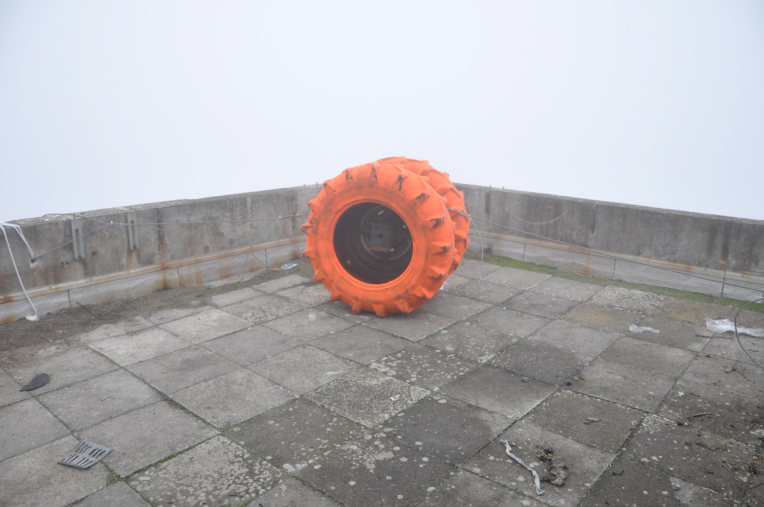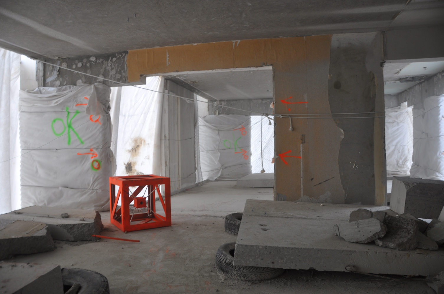 L’équipe Crash Box est arrivée sur le site de la Tour Plein Ciel la veille de son foudroyage. La visite de chantier a été consacrée à la vérification des emplacements des crash box, le placement des noyaux en mousse à l’intérieur des boîtes blindées destinées à recevoir les caméras et l’ajustement des cadrages. Au moment de quitter le chantier, la tour avait complètement disparue, dissimulée sous une épaisse brume, comme si seule la vue intérieure de la démolition s’apprêtait à subsister pour le lendemain...