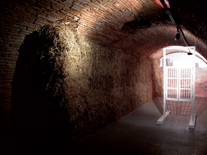 Impression numérique sur papier intissé, porte va-et-vient en bois et métal, bottes de paille vidéo projection en boucle (durée 53’)