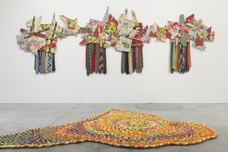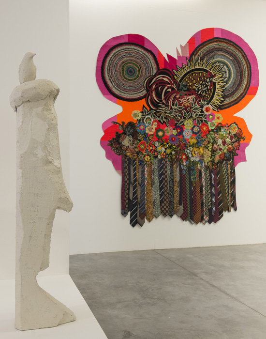 A la rationalité expérimentale de Virginie et à son humour discret répondent l’extraversion artistique de Sandra Lecoq: une forme de vitalisme qui ne craint ni la surcharge, ni la provocation, ni l’intrication dans l’oeuvre d’une part autobiographique, toutes choses constituant le carburant énergétique de son moteur de production. Pour l’exposition elle met en regard des pièces au mur, une photographie et des éléments de sculpture. Cet échantillonnage de son oeuvre récente fait la part belle à de grands assemblages qui occupent la situation murale de la peinture. Ils se composent d’une frise exubérante de fragments de tissus marouflés sur des supports rigides d’où surgissent des flots de cravates d’hommes qui pointent vers le sol comme autant de coulures readymade. Là, comme chez Virginie, l’évocation de la peinture se fait au travers d’un dispositif non pictural, mais l’abstraction qu’il convoque se rapproche plus des assemblages néo baroques d’un Stella dernière manière que de géométries austères des pères fondateurs de la peinture abstraite. Face à cette exubérance, puissante par ses couleurs et le rythme dynamique de sa composition, Sandra installe la blancheur plâtrée des “uccelli di felicita” qui semblent la traduction en sculpture de dessins d’oiseaux dont ils conservent quelque chose de la spontanéité du geste. En contrepoint elle montre aussi une photographie “Gio et le coq” où l’on voit un enfant (son fils Gio) dessiner sur le dos de sa mère le coq qui la signifie patronymiquement.