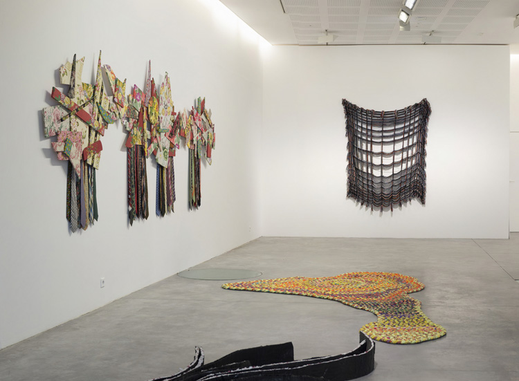Ces “lainages” seront confrontés à un “arrangement” regroupant une série de pièces plus anciennes qui sont autant d’expérimentations sur des matériaux, principalement des polymères issus de l’industrie chimiques mais aussi provenant d’une origine organique (algues) dont elle explore systématiquement les propriétés formelles par pliage, fronçage, enroulage, tressage... Ce travail exploratoire a fait l’objet en 2005 d’une récapitulation sérielle sous le titre: ”Typologie des formes”, clin d’oeil humoristique au sérieux pseudo scientifique de certains rapprochements entre l’art et la science. Il est à noter que si l’ensemble de ces séries est disponible pour une infinité de présentations, l’artiste indique en préférant le terme “arrangement” à celui d’installation, à la fois l’autonomie sculpturale de chaque élément qui les constitue et leur capacité à occuper des situations spatiales