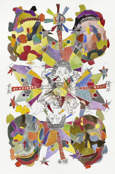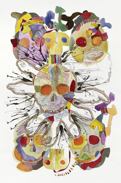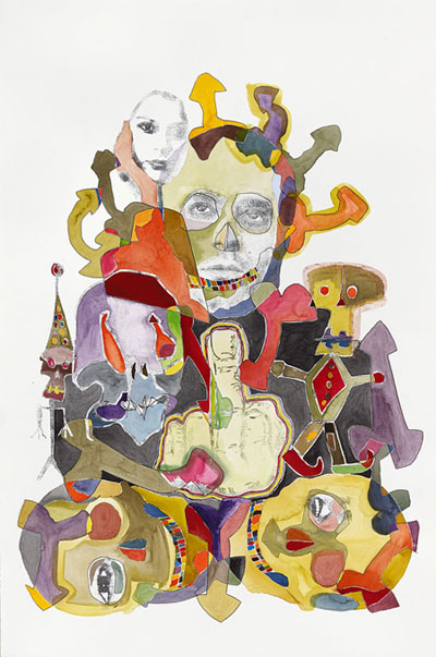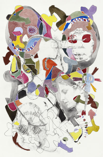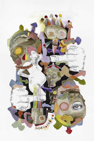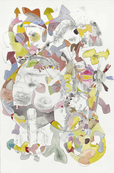 Dessin, transfert et aquarelle sur papier, 80 x 120 cm |
