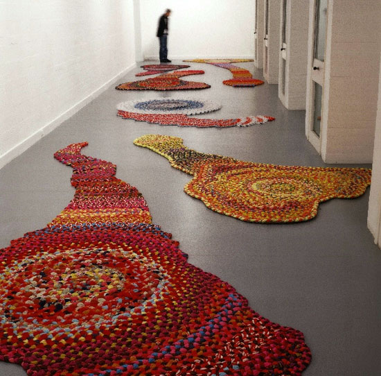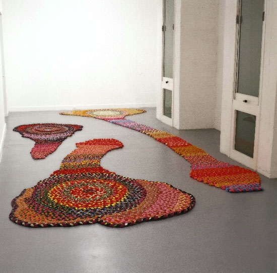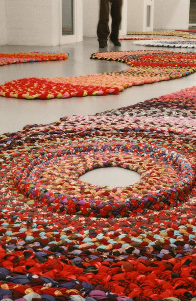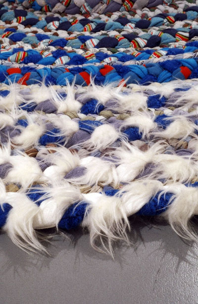 Les pièces présentées à la Villa Arson, dans le long couloir de la galerie des cyprès, sont extraites de la série penis Carpets : quand les tresses de tissu, t’en souvient-il, sur elles-mêmes débordent en phallus suggestifs.