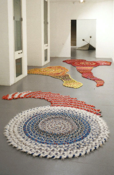coupons et chiffons, fragments collectés, sont patiemment tressés, noués, mis en nattes. Dissimulent dans leurs plis des bouts du monde. n’en reste qu’un soupir tant les noeuds sont serrés.
