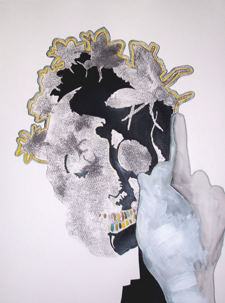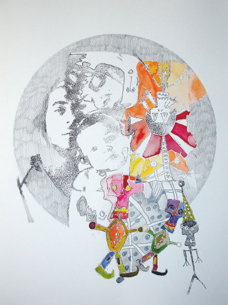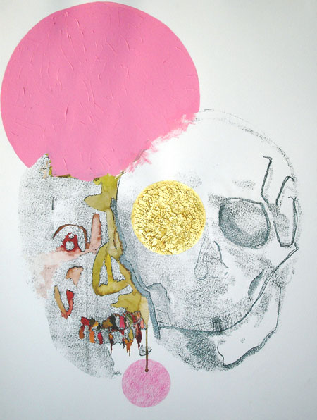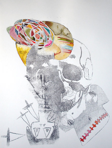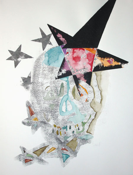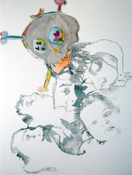 Transfert crayon, aquarelle et acrylique sur papier, 50 x 67 cm