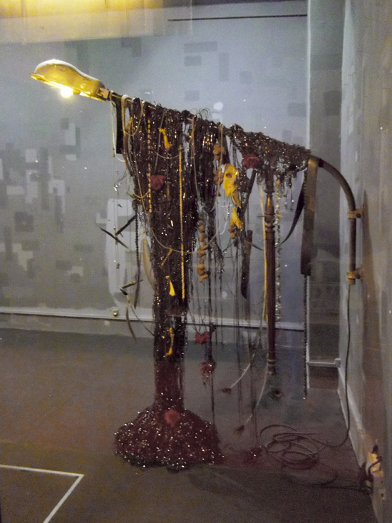 Lampadaire urbain mural, bandes magnétiques de Bowie à Anro (toute ma jeunesse), os, plumes, machettes, montant de lit, clous, ficelles, cordes, perles, roses artificielles, éléments divers ramassés dans la rue