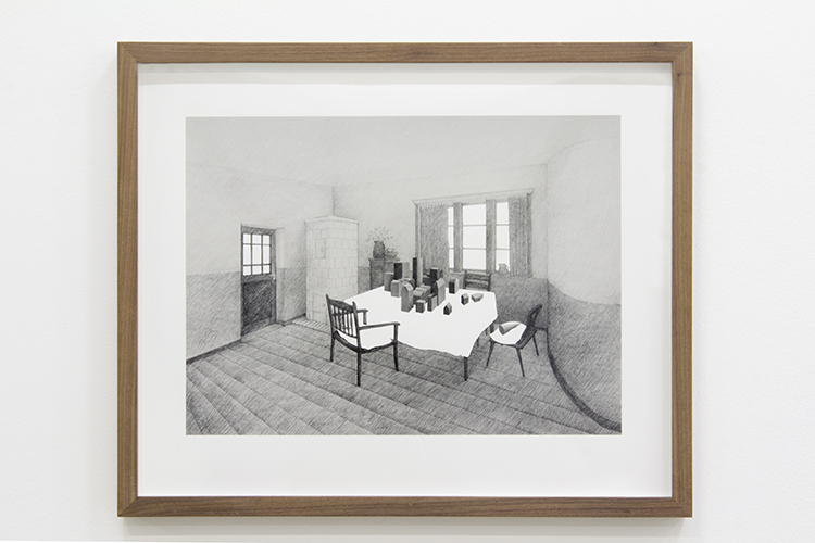 Un même espace répété à l’identique accueille des propositions urbanistiques variées. Repris des dessins de l’architecte allemand Heinrich Tessenow dans son ouvrage Wohnhausbau paru en 1927, l’intérieur dessiné est celui d’une maison champêtre allemande du début du XXème siècle. Sur la table, le blanc de la nappe accueille des blocs architectoniques disposés dans des configurations variées. Façonnés à partir de nuances de gris taillées dans des photographies d’intérieur provenant du livre de Tessenow puis collées ensemble numériquement, les