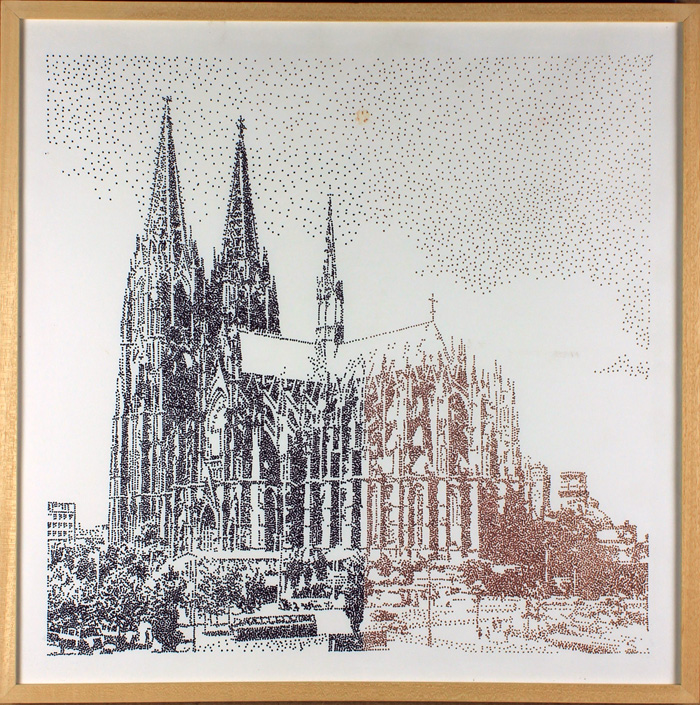 L’image de grande taille est extraite du film Les carabiniers. Il s’agit d’un peloton d’exécution qui rappelle un motif traité notamment par Goya et Manet. Les dessins plus petits entreposés devant représentent des « merveilles du monde (série monuments) », citées dans le film ou non.