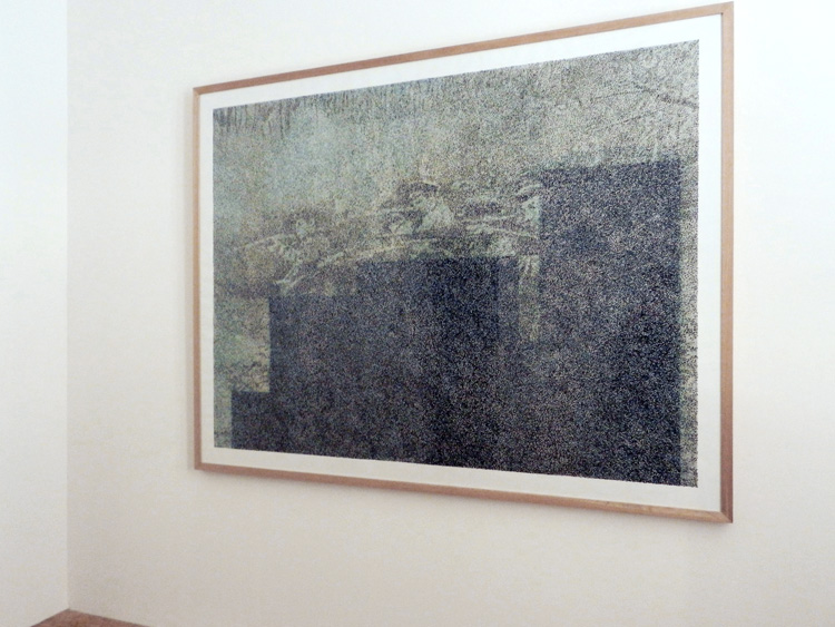 L’exposition en atelier a été « désolidarisée » pour être accrochée de manière traditionnelle dans la galerie, mais la mémoire en est conservée par les différentes altérations des dessins.
