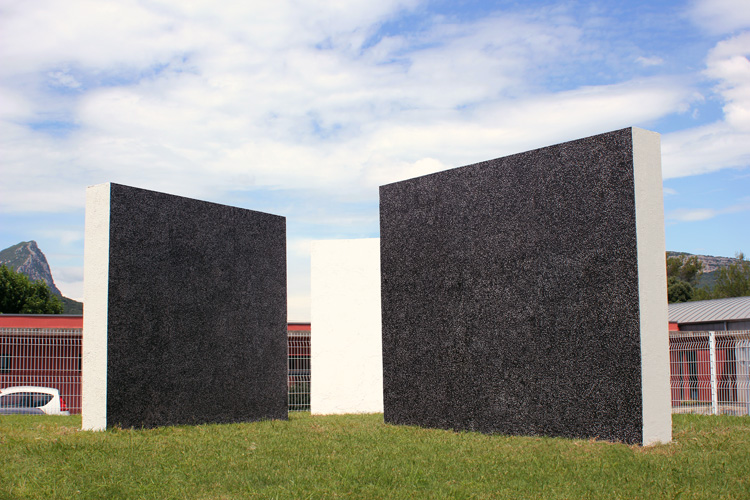 Pour la première fois, avec cette installation, je confronte les principe des dessins néguentropiques à la question de l'extérieur. Les trois structures blanches font une jonction entre l'architecture de l'hôtel de la communauté de communes et le paysage, tandis que les dessins se révèlent en fonction de leur orientation par rapport à la course du soleil. |