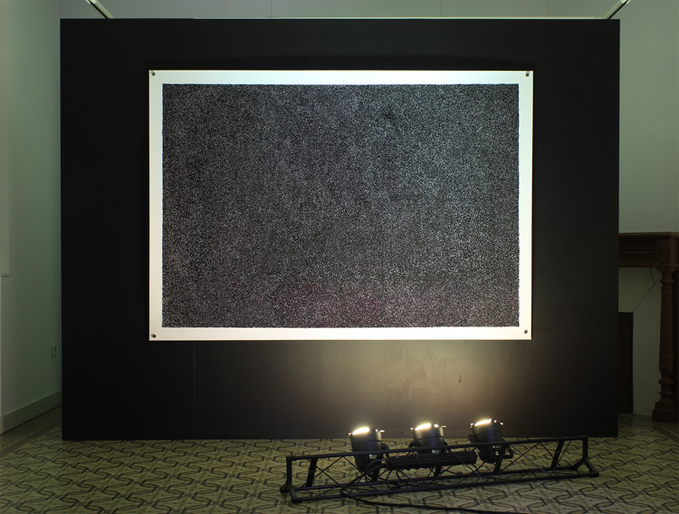 Dessin néguentropique, feutre et encre pigmentaire, éclairage u.v sur papier, 152 x 218 cm |