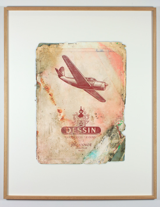 Outre des dessins néguentropiques et des dessins aux verres anti-UV brisés, l'exposition présente un scan agrandi d'un cahier de dessin de Paulette. (Je collectionne les vieux cahiers de dessin et j'envisageais d'en produire des images un jour. Le cahier de dessin de Paulette Galice est peut-être le premier d'un ensemble.) Je montre également deux dessins d'un autre enfant (Ollivier Trabuc) qui ont été modifiés par l'humidité.