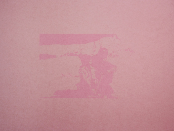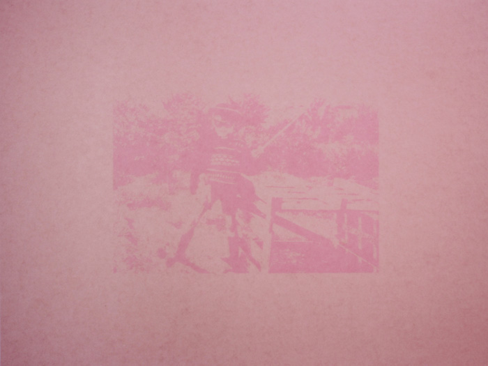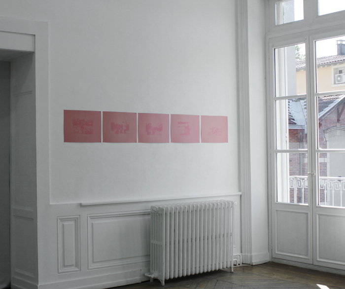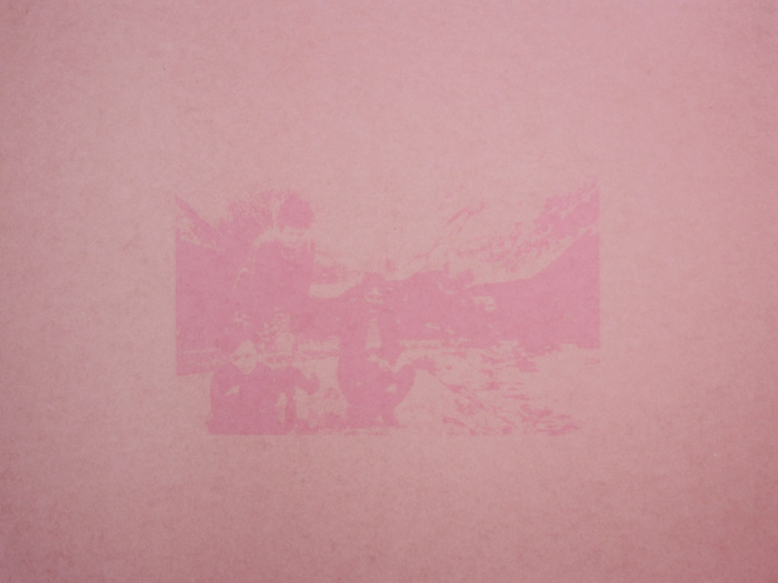 | Un week end à la maison est une pièce conçue pour l’exposition Déjà Septembre, à l’Attrape-couleurs, à Lyon en juin 2014. Dans la maison familiale, j’ai scanné d’anciennes diapositives de famille prises par mon père dans les années 70, et récupéré de vieux papiers d’imprimerie qu’il utilisait dans son travail. A partir des scans de diapositives, j’ai tiré des films noirs et blancs que j’ai déposés sur les feuilles et exposé le tout à la lumière solaire durant plusieurs mois. La décoloration produite par le soleil à travers le film laisse apparaître l’empreinte des images. |
